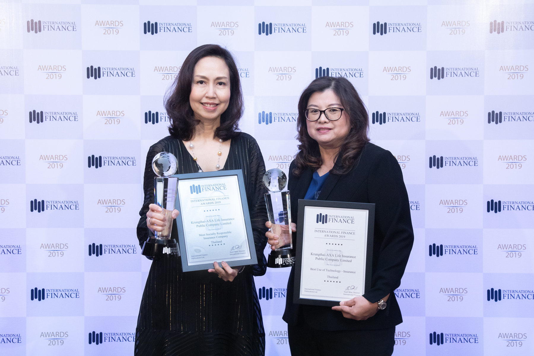 3 กุมภาพันธ์ 2563 : คุณภควิภา เจริญตรา ประธานเจ้าหน้าบริหาร ฝ่ายลูกค้า (คนซ้าย) บมจ.กรุงไทย-แอกซ่า ประกันชีวิต และคุณทิพาพันธ์ เฟื่องปัญญา ประธานเจ้าหน้าบริหาร ฝ่ายปฏิบัติการ (คนขวา) รับ 2 รางวัลระดับนานาชาติจาก International Financial Award 2019 สาขา Best Use of Technology และสาขา Most Socially Responsible Insurance Company รางวัลนี้ถือเป็นอีกหนึ่งความภาคภูมิใจ และความสำเร็จของการเป็นผู้นำประกันชีวิตด้านเทคโนโลยีระดับนานาชาติ และตอกย้ำความมุ่งมั่นของบริษัทฯ ในการช่วยเหลือสังคมอย่างยั่งยืนตลอดมา เพื่อให้โอกาสทุกคนได้มีชีวิตที่ดีขึ้นตามใจปรารถนา โดยพิธีมอบรางวัลดังกล่าว จัดขึ้น ณ โรงแรมวอลดอร์ฟ แอสโทเรีย กรุงเทพฯ