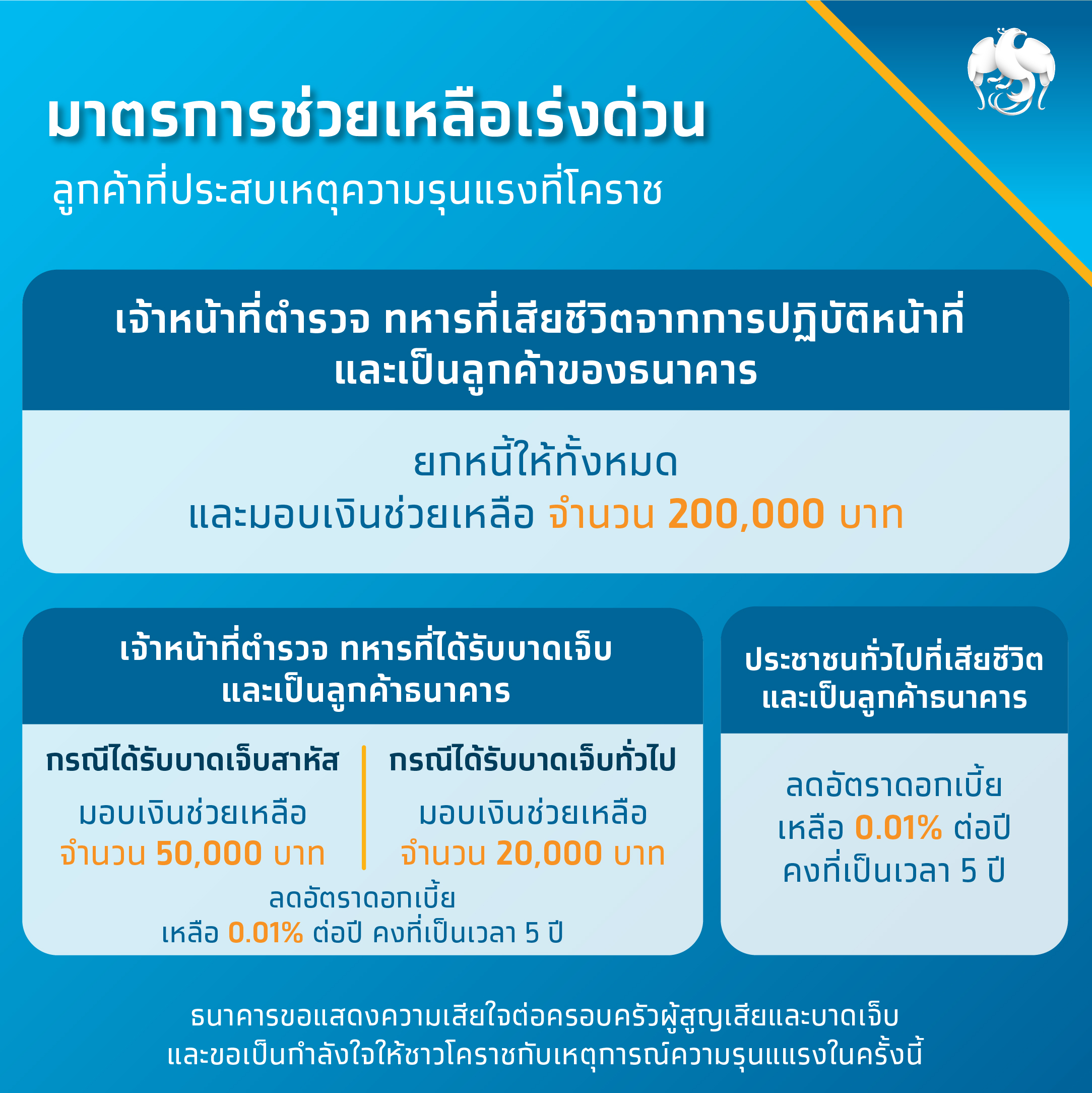 10 กุมภาพันธ์ 2563 : ธนาคารกรุงไทยออกมาตรการช่วยเหลือเร่งด่วนยกหนี้ให้กับเจ้าหน้าที่ตำรวจ ทหาร ที่เสียชีวิตจากการปฏิบัติหน้าที่และเป็นลูกค้าของธนาคาร พร้อมมอบเงินให้กับครอบครัว จำนวน 200,000 บาท รวมทั้งมอบเงินช่วยเหลือ และลดดอกเบี้ยกรณีบาดเจ็บ สำหรับลูกค้าประชาชนทั่วไปที่เสียชีวิต ลดดอกเบี้ยเหลือ 0.01% ต่อปี คงที่เป็นเวลา 5 ปี พร้อมประสานกับบริษัทประกันจ่ายค่าสินไหมทดแทนให้ลูกค้าเร่งด่วน