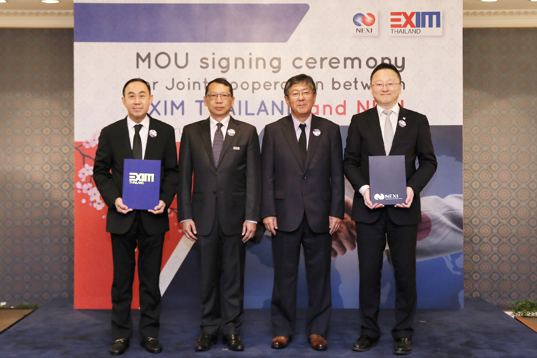 โดยมีนายนะชิดะ คะสุยะ เอกอัครราชทูตประเทศญี่ปุ่นประจำประเทศไทย และนายพิริยะ เข็มพล กรรมการ EXIM BANK เป็นสักขีพยานกิตติมศักดิ์ในพิธีลงนาม เพื่อใช้บริการประกันการส่งออกและการลงทุนของ EXIM BANK เป็นเครื่องมือในการบริหารความเสี่ยงของผู้ส่งออกและนักลงทุนไทยและญี่ปุ่น โดยเฉพาะในตลาด CLMV และพื้นที่ระเบียงเศรษฐกิจพิเศษภาคตะวันออก (Eastern Economic Corridor : EEC) ของไทย ณ โรงแรมแมนดาริน โอเรียนเต็ล กรุงเทพฯ เมื่อวันที่ 11 กุมภาพันธ์ 2563