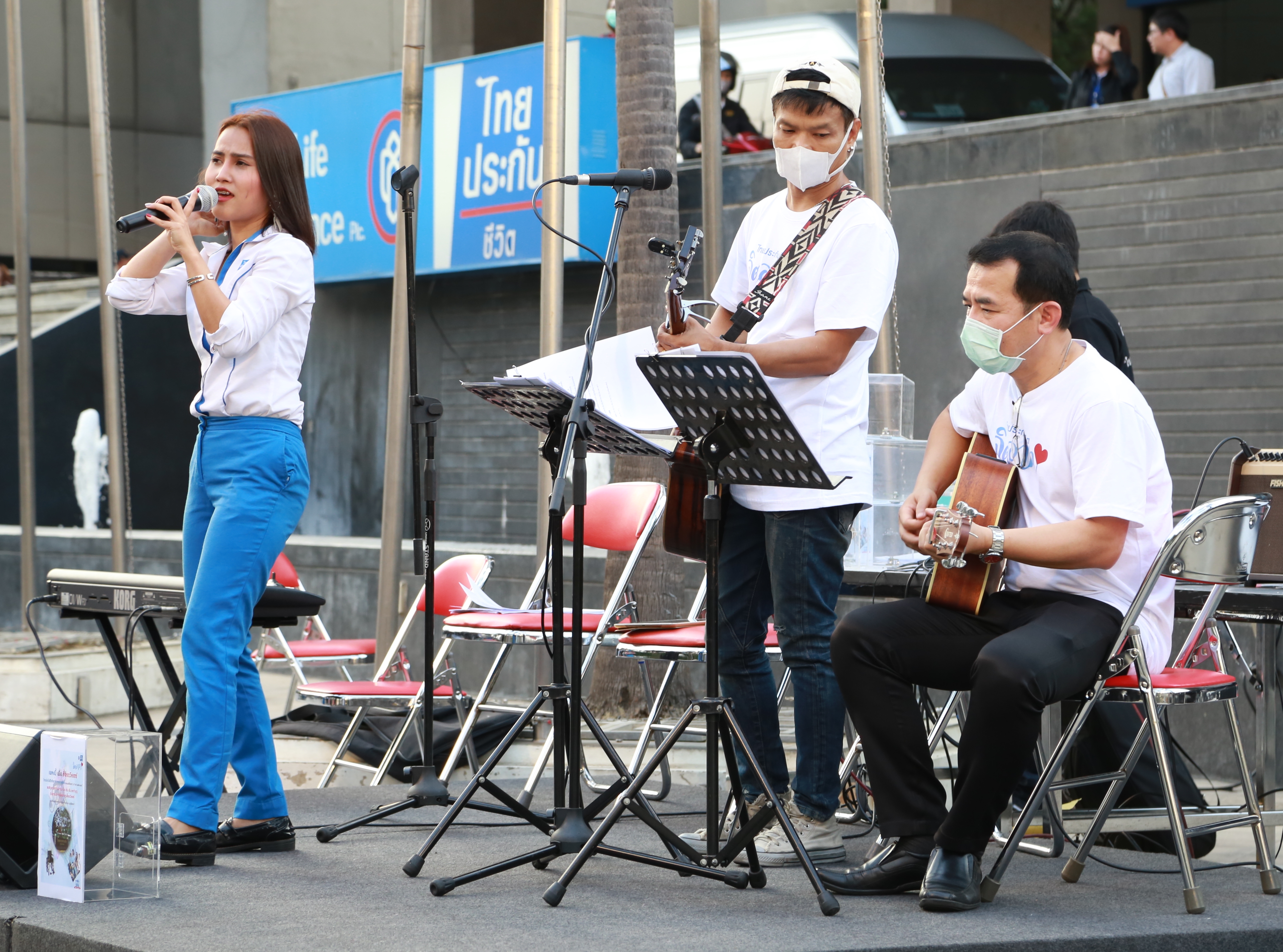 12 กุมภาพันธ์ 2563 : กลุ่มพนักงานจิตอาสาไทยประกันชีวิต สายงานสินไหม บริษัท ไทยประกันชีวิต จำกัด (มหาชน) ร่วมกับ วงดนตรี “We Thailife Band” และ วงดนตรี “สหาย” จากตำรวจชุมชนสัมพันธ์ สน. ห้วยขวาง จัดแสดงดนตรีจิตอาสา “ร้อง เล่น เต้น และทำบุญ” รณรงค์เงินบริจาคเพื่อสมทบทุนซื้ออุปกรณ์ทางการแพทย์ มอบให้โรงพยาบาลท่าตะเกียบ จ. ฉะเชิงเทรา ณ บริเวณด้านหน้าอาคารไทยประกันชีวิต สำนักงานใหญ่ ![]()