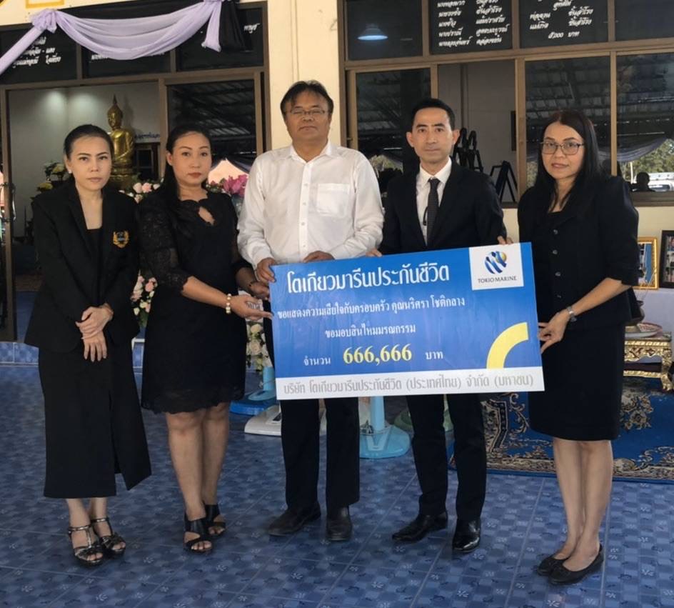 13 กุมภาพันธ์ 2563 : บริษัท โตเกียวมารีนประกันชีวิต (ประเทศไทย) จำกัด (มหาชน) ขอแสดงความเสียใจต่อลูกค้าผู้เสียชีวิตและผู้ได้รับผลกระทบทุกรายจากเหตุการณ์กราดยิงที่โคราช โดยบริษัทได้มอบสินไหมประกันชีวิต จำนวน 666,666 บาท ให้แก่ ธีรศักดิ์ โชติกลาง สามีผู้เสียชีวิตจากเหตุการณ์กราดยิงที่จังหวัดนครราชสีมา โดย ขจรศักดิ์ มณีอินทร์ ผู้อำนวยการอาวุโสฝ่ายขาย เป็นตัวแทนบริษัทมอบสินไหมประกันชีวิต ![]()