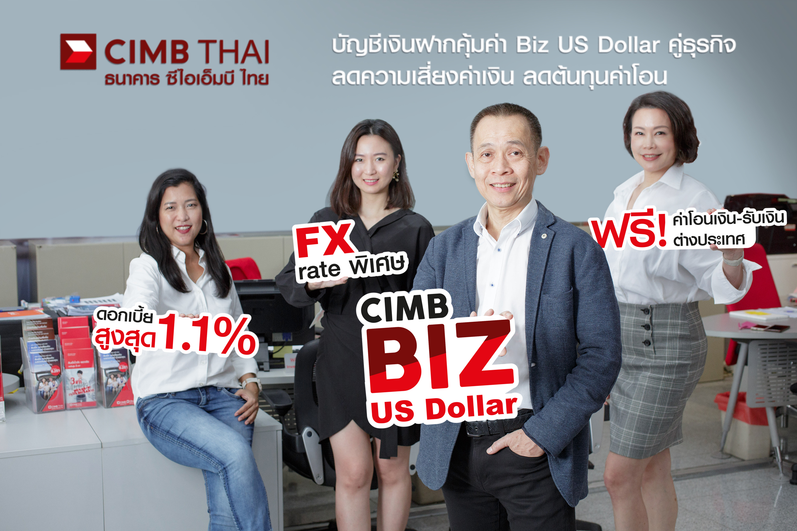โดยบัญชี CIMB Biz US Dollar เป็นบัญชีที่คุ้มค่าคู่ควรกับคนทำธุรกิจ ลูกค้าจะได้รับ ฟรีค่าธรรมเนียมการโอนเงินและการรับเงินต่างประเทศ รับดอกเบี้ยสูงถึง 1.1% โดยเฉพาะอย่างยิ่งธุรกิจที่ทำการค้าขายเป็นเงิน US Dollar สะดวกยิ่งขึ้นเพราะไม่ต้องแลกเงินกลับไปกลับมา ไม่ต้องเสี่ยงต่อความผันผวนเรื่องค่าเงิน และถ้าต้องการแลกเปลี่ยนเงินตราเพื่อหมุนเวียนทำธุรกิจในส่วนอื่นๆ บัญชี CIMB Biz US Dollar นี้ ยังเสนออัตราแลกเปลี่ยนสุดพิเศษให้ลูกค้าอีกด้วย สนใจสอบถามเพิ่มเติมได้ที่ ธนาคาร ซีไอเอ็มบี ไทย โทร 02 626 7771 ![]()