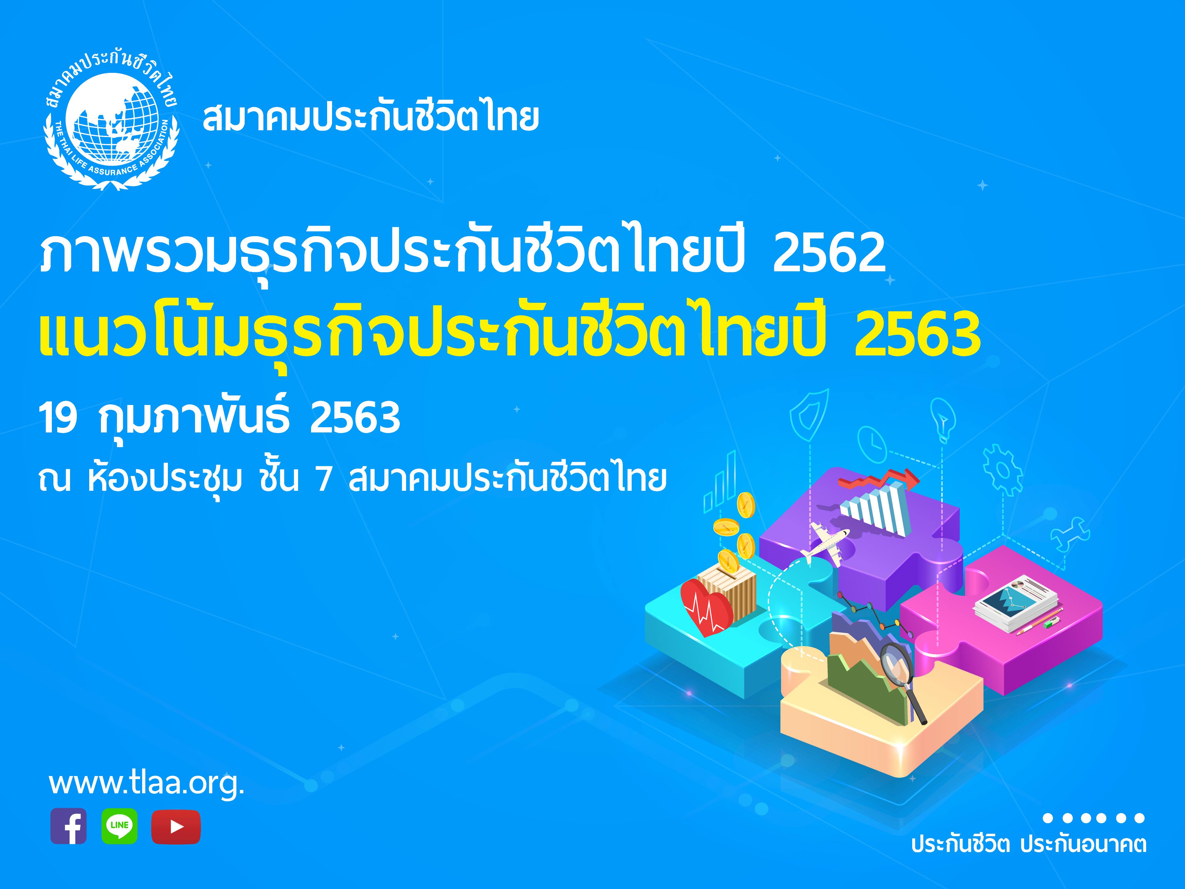 19 กุมภาพันธ์ 2563 : สมาคมประกันชีวิตไทย คาดการณ์ปี 2563 ธุรกิจประกันชีวิตจะไม่มีการเติบโต โดยจะมีเบี้ยประกันภัยรับรวม 610,000 ล้านบาท เหตุปัจจัยท้าทายรอบด้าน เผยจับตลาด 4 ด้านยังโตได้สวย ประกันสุขภาพ-ยูนิตลิงค์-ประกันชีวิตแบบระยะยาว และประกันออนไลน์ ส่วนธุรกิจประกันชีวิตปี 2562 ที่ผ่านมาเติบโตลดลงที่ร้อยละ 2.63 ด้วยผลงานเบี้ยประกันภัยรับรวม 610,914.11 ล้านบาท และมีอัตราความคงอยู่ของกรมธรรม์ที่ร้อยละ 80
