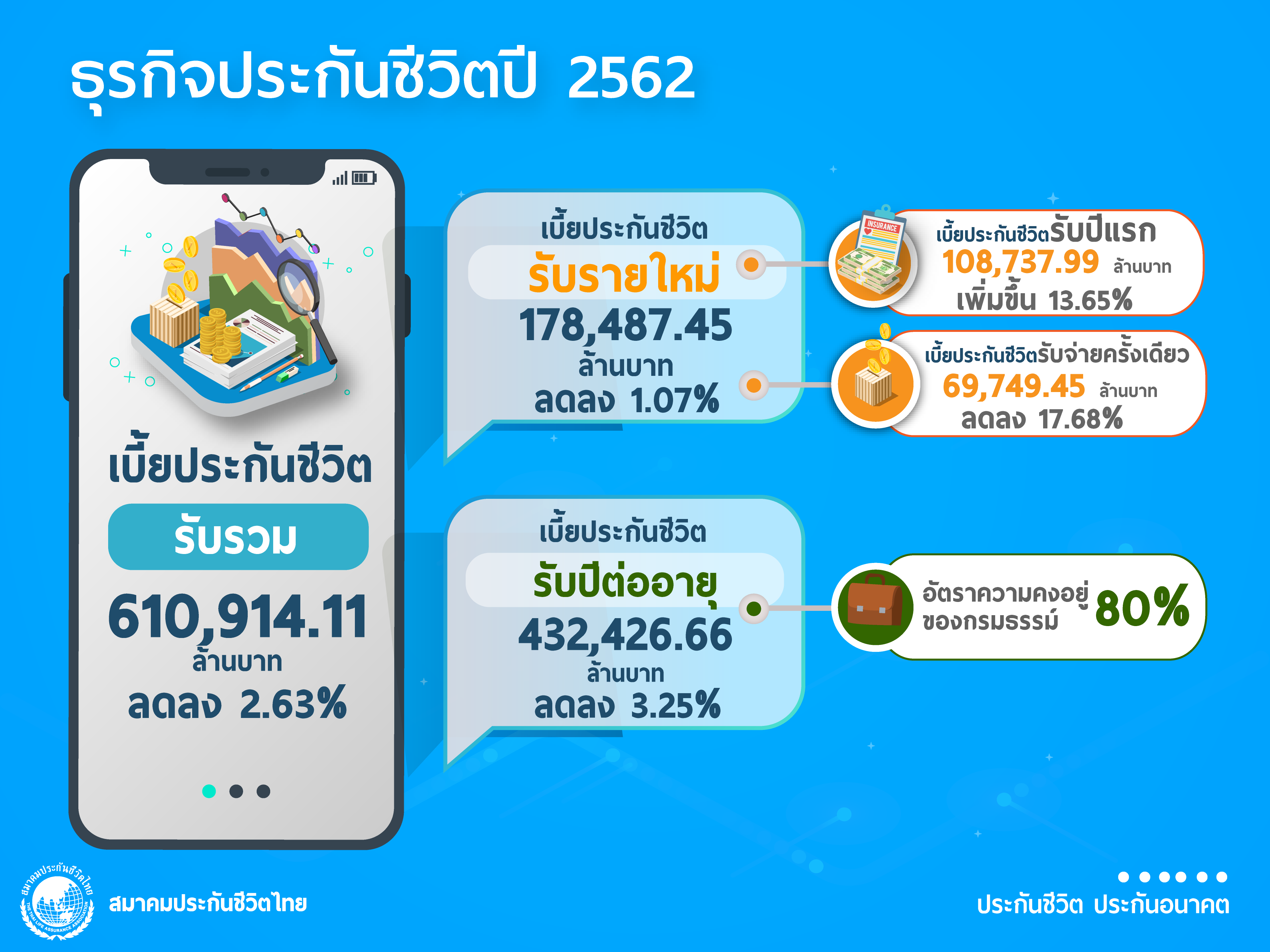 จากปัจจัยท้าทายเหล่านี้ส่งผลให้ธุรกิจประกันชีวิตมีเบี้ยประกันชีวิตรับรวม (มกราคม – ธันวาคม 2562) 610,914.11 ล้านบาท คิดเป็นอัตราเติบโตลดลงร้อยละ 2.63 เมื่อเทียบกับปีที่ผ่านมา จำแนกเป็นเบี้ยประกันชีวิตรายใหม่ (New Business Premium) จำนวน 178,487.45 ล้านบาท อัตราเติบโตลดลงร้อยละ 1.07 โดยแยกเป็นเบี้ยประกันชีวิตรับปีแรก 108,737.99 ล้านบาท อัตราการเติบโตเพิ่มขึ้นร้อยละ 13.65 เบี้ยประกันภัยรับจ่ายครั้งเดียว 69,749.45 ล้านบาท อัตราการเติบโตลดลงร้อยละ 17.68 เบี้ยประกันชีวิตปีต่อไป (Renewal Year Premium) 432,426.66 ล้านบาท อัตราการเติบโตลดลงร้อยละ 3.25 ซึ่งมีอัตราการคงอยู่ของกรมธรรม์ประกันชีวิตร้อยละ 80