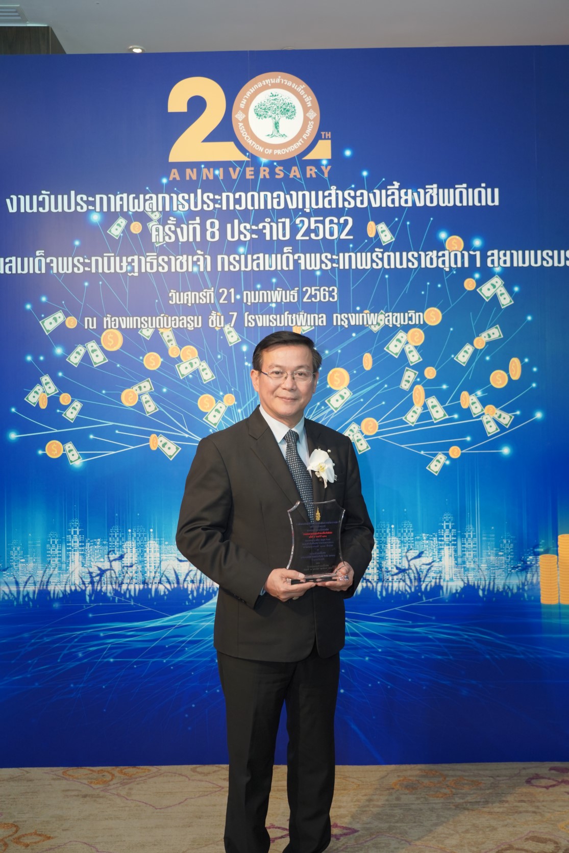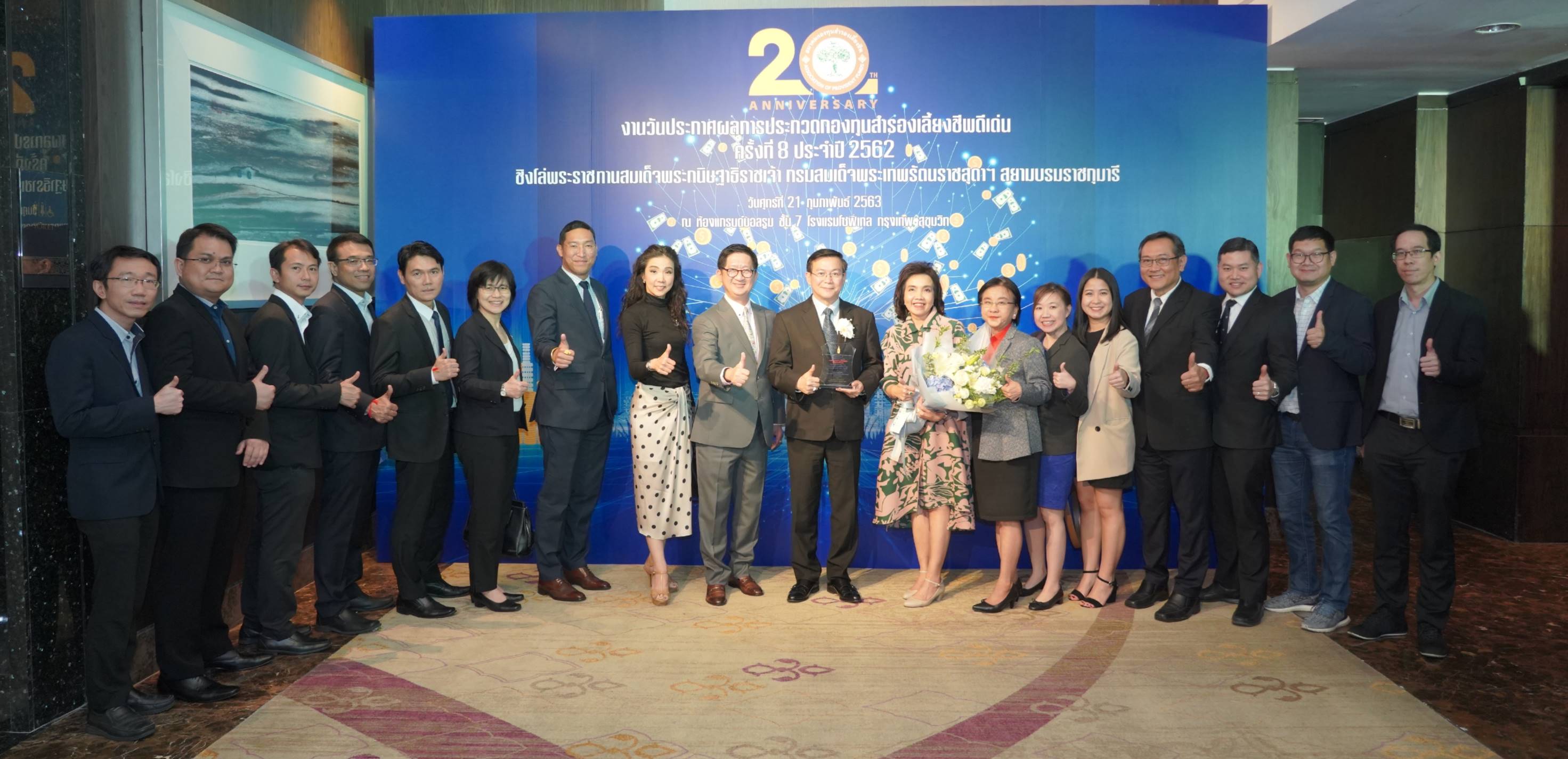 22 กุมภาพันธ์ 2563 : ดร.สมพร สืบถวิลกุล กรรมการผู้จัดการใหญ่ บมจ.ทิพยประกันภัย เข้ารับพระราชทานโล่รางวัลชนะเลิศ สมเด็จพระกนิษฐาธิราชเจ้า กรมสมเด็จพระเทพรัตนราชสุดาฯ สยามบรมราชกุมารี จากโครงการประกวดกองทุนสำรองเลี้ยงชีพดีเด่น ในประเภท Single fund กลุ่มหน่วยงานภาคเอกชนที่มีขนาดกองทุนมากกว่า 1,000 ล้านบาท ใน “งานวันประกาศผลการประกวดและมอบรางวัลการประกวดกองทุนสำรองเลี้ยงชีพดีเด่น ครั้งที่ 8 ประจำปี 2562” ซึ่งจัดโดยสมาคมกองทุนสำรองเลี้ยงชีพ ณ ห้องแกรนด์บอลรูม โรงแรมโซฟีเทล สุขุมวิท ![]()