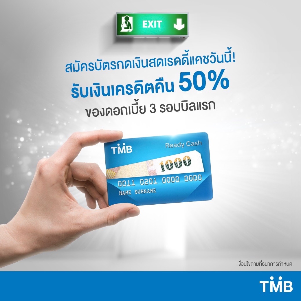 24 กุมภาพันธ์ 2563 : ทีเอ็มบี สร้างชีวิตทางการเงินที่ดีขึ้นให้แก่คนไทย มอบสิทธิประโยชน์ที่คุ้มค่าตอบโจทย์ทุกความต้องการของลูกค้า จัดโปรโมชั่นพิเศษสำหรับบัตรกดเงินสด TMB Ready Cash เพียงสมัครและทำรายการเบิกถอนเงินสด รับเครดิตเงินคืน 50% ของจำนวนดอกเบี้ยที่ธนาคารเรียกเก็บจากยอดเบิกถอนเงินสดในแต่ละรอบบัญชีเป็นจำนวน 3 รอบบัญชี นับจากรอบบัญชีที่บัตรได้รับการอนุมัติ (สำหรับยอดค้างชำระที่ไม่เกิน 50,000 บาท หรือรับเครดิตเงินคืนสูงสุดไม่เกิน 3,400 บาท) สงวนสิทธิ์โปรโมชั่นสำหรับผู้สมัครบัตรกดเงินสด TMB Ready Cash ใบแรก ที่สมัครตั้งแต่วันที่ 15 ก.พ. 63 – 30 มิ.ย. 63 และ ได้รับอนุมัติตั้งแต่วันที่ 15 ก.พ. 63 – 7 ก.ค. 63 เงื่อนไขเป็นไปตามที่ธนาคารกำหนด สอบถามรายละเอียดเพิ่มเติมได้ที่TMB Contact Center โทร. 1558 และดูรายละเอียดเพิ่มเติมที่ www.tmbbank.com ![]()