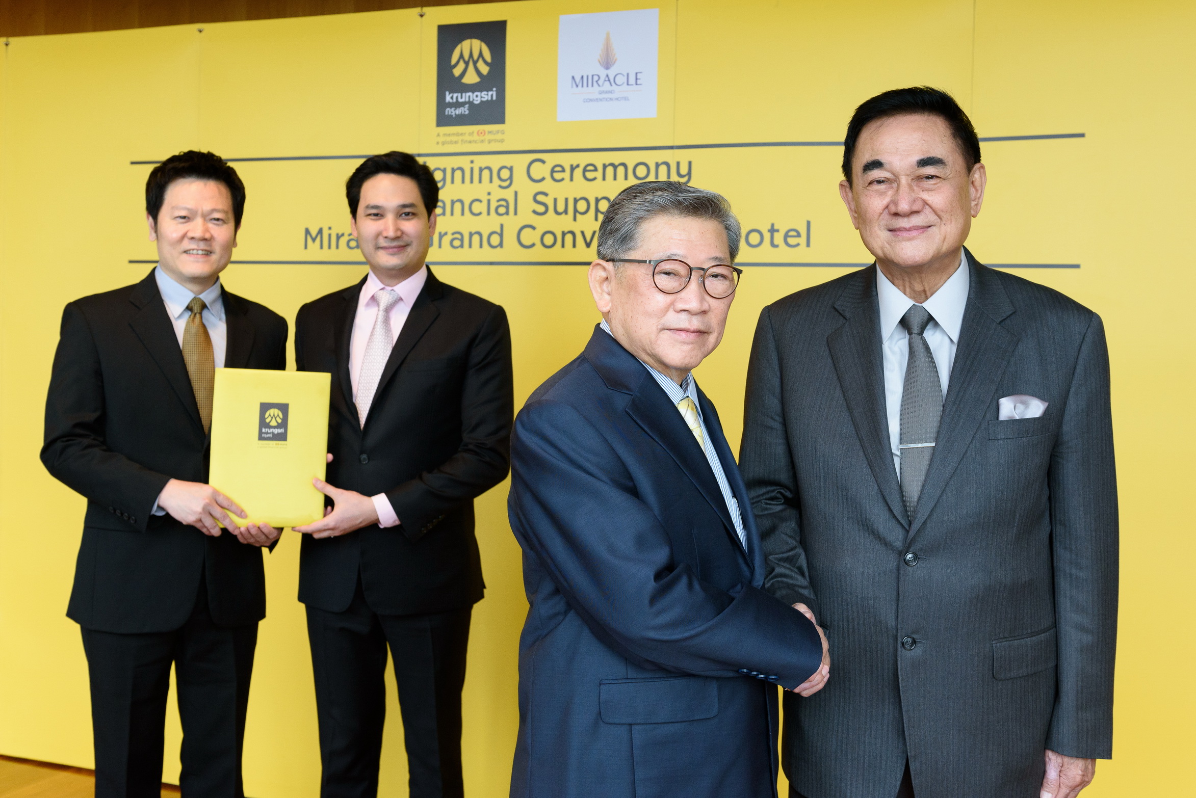 กรุงเทพฯ 24 กุมภาพันธ์ 2563 : การุณ กิตติสถาพร (ที่ 2 จากขวา) ประธานกรรมการ และ สยาม ประสิทธิศิริกุล (ซ้ายสุด) ประธานคณะเจ้าหน้าที่ด้านลูกค้าธุรกิจ SME ธนาคารกรุงศรีอยุธยา จำกัด (มหาชน) พร้อมด้วย ดร. อัศวิน อิงคะกุล (ขวาสุด) ประธานกลุ่มบริษัทในเครือมิราเคิล กรุ๊ป และนายอนัคพล อิงคะกุล (ที่ 2 จากซ้าย) รองประธานกลุ่มบริษัทในเครือมิราเคิล กรุ๊ป ร่วมพิธีลงนามสัญญาสนับสนุนทางการเงินเพื่อรองรับการเติบโตของธุรกิจโรงแรม การประชุมและสัมมนาในเครือมิราเคิล กรุ๊ป ![]()