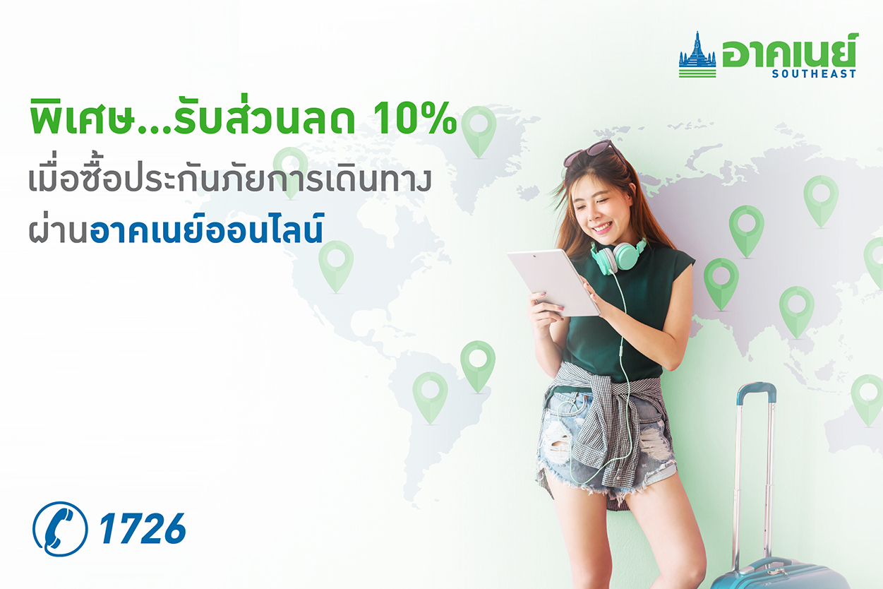 สำหรับผู้ที่สนใจ สามารถซื้อประกันภัยการเดินทาง แทรเวล ออลอินวัน ผ่านอาคเนย์ออนไลน์ ที่ให้ความสะดวกสบาย เพราะอยู่ที่ไหนก็ซื้อได้ง่ายๆ ตลอด 24 ชั่วโมง พร้อมรับส่วนลดสูงสุดทันที 10% เพียงกรอกรหัส SEGTA10 ตั้งแต่วันนี้ – 31 กรกฎาคม 2563 ผ่าน https://seic.segroup.co.th
