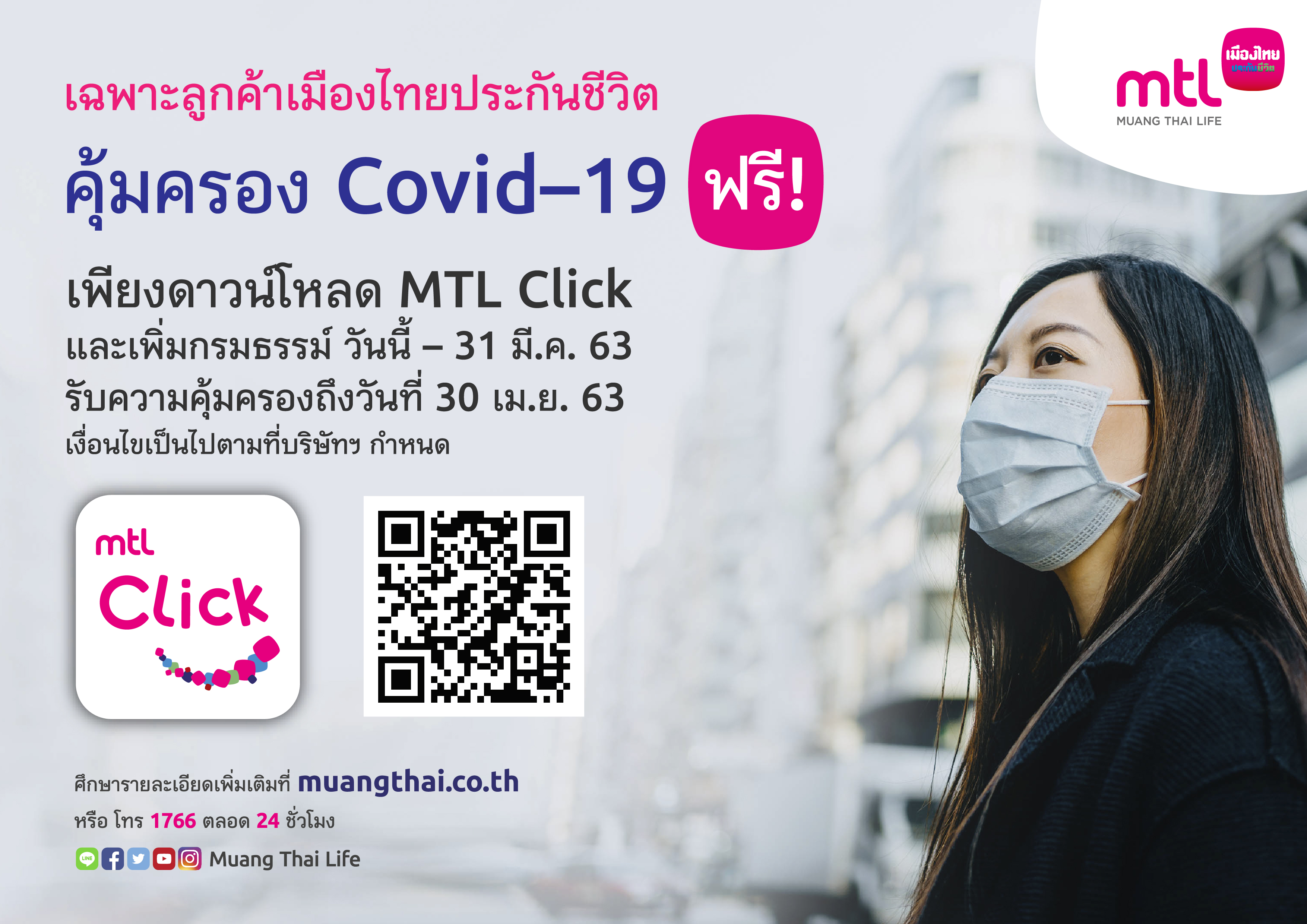 โดยคุ้มครองกรณีเสียชีวิต ที่มีสาเหตุจากการติดเชื้อไวรัสโคโรนาสายพันธุ์ใหม่ 2019 (COVID-19) รับเงินชดเชย 100,000 บาท หรือรับเงินชดเชยรายวัน 1,000 บาทต่อวัน เมื่อเข้าพักรักษาตัวในฐานะผู้ป่วยในของโรงพยาบาล ที่มีสาเหตุจากการติดเชื้อไวรัสโคโรนาสายพันธุ์ใหม่ 2019 (COVID-19) สูงสุดไม่เกิน 30 วัน ต่อการเข้าพักรักษาตัวในฐานะผู้ป่วยในครั้งใดครั้งหนึ่ง เพียงครั้งเดียว โดยให้ความคุ้มครองทันทีตั้งแต่วันที่ดาวน์โหลดและเพิ่มกรมธรรม์เสร็จสมบูรณ์ ดาวน์โหลด แอปพลิเคชัน “MTL Click” ได้แล้วตั้งแต่วันนี้จนถึงวันที่ 31 มีนาคม 2563 และรับความคุ้มครองได้ถึงวันที่ 30 เมษายน 2563