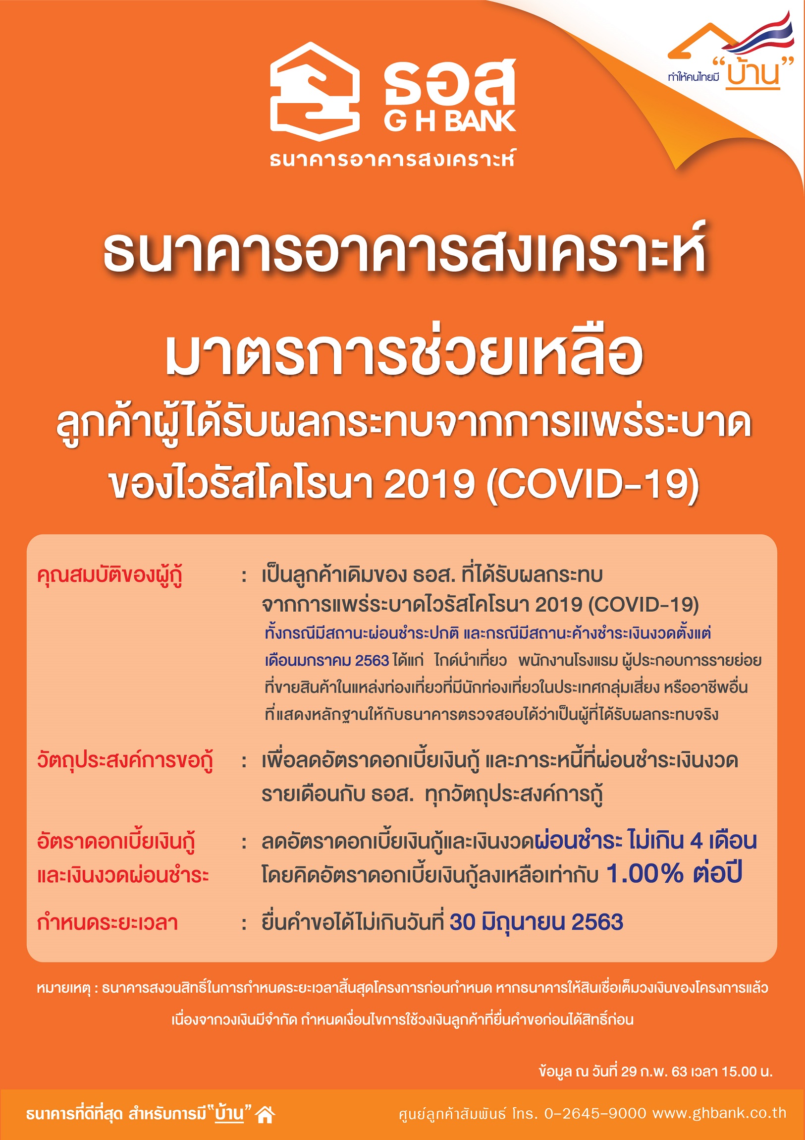 3 มีนาคม 2563 : นายฉัตรชัย ศิริไล กรรมการผู้จัดการ ธนาคารอาคารสงเคราะห์ (ธอส.) เปิดเผยว่า ตามที่ได้เกิดการแพร่ระบาด ของโรคติดเชื้อไวรัสโคโรนา 2019 (COVID-19) จึงได้จัดทำมาตรการเพิ่มเติม เพื่อบรรเทาความเดือดร้อนให้แก่ลูกค้าปัจจุบันของธนาคารที่ได้รับผลกระทบจากสถานการณ์ดังกล่าวให้มีความสอดคล้องกับสถานการณ์ปัจจุบันยิ่งขึ้น และครอบคลุมกลุ่มลูกค้าทั้งในกรณีที่ยังมีสถานะผ่อนชำระปกติ และกรณีมีสถานะค้างชำระเงินงวดตั้งแต่เดือนมกราคม 2563 โดยเตรียมกรอบวงเงิน 10,000 ล้านบาท จัดทำ “มาตรการช่วยเหลือลูกค้าผู้ได้รับผลกระทบจากการแพร่ระบาดของไวรัสโคโรนา 2019 (COVID-19)”