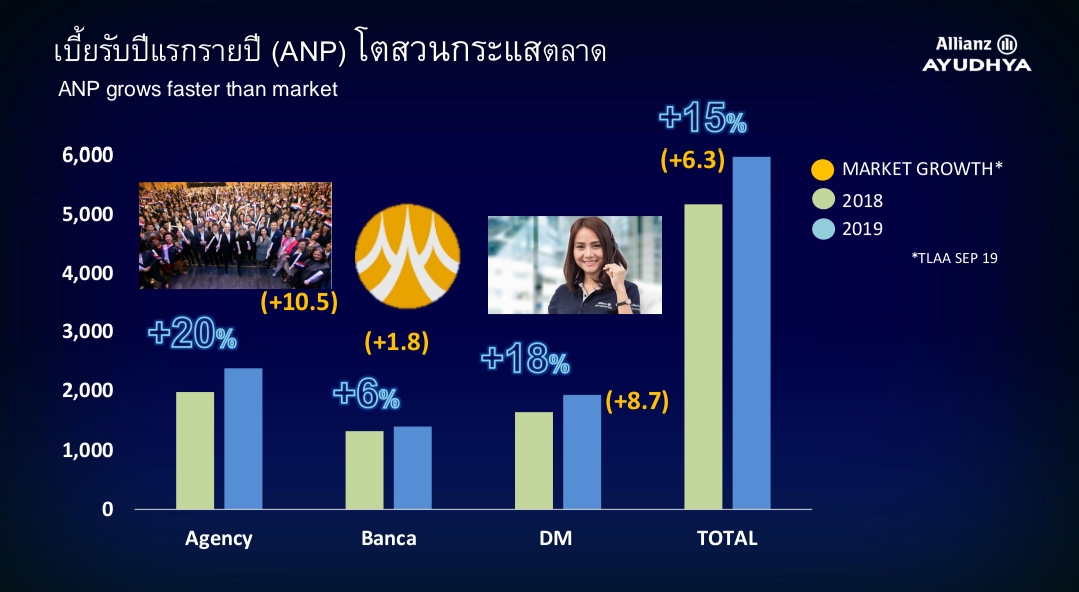 โดยช่องทางตัวแทนซึ่งเป็นช่องทางหลักของบริษัททำผลงานดีเยี่ยมในรอบทศวรรษ เติบโตถึง 20% ด้วยเบี้ยรับปีแรกถึง 2,383 ล้านบาท ช่องทางแบงก์แอสชัวรันซ์ 1,399 ล้านบาท เติบโต 6% และช่องทางขายตรง ยังคงครองอันดับหนึ่งในตลาดถึง 11 ปีซ้อน ด้วยเบี้ย 1,934 ล้านบาท เติบโต 18% เทียบกับช่วงเดียวกันของปีก่อน