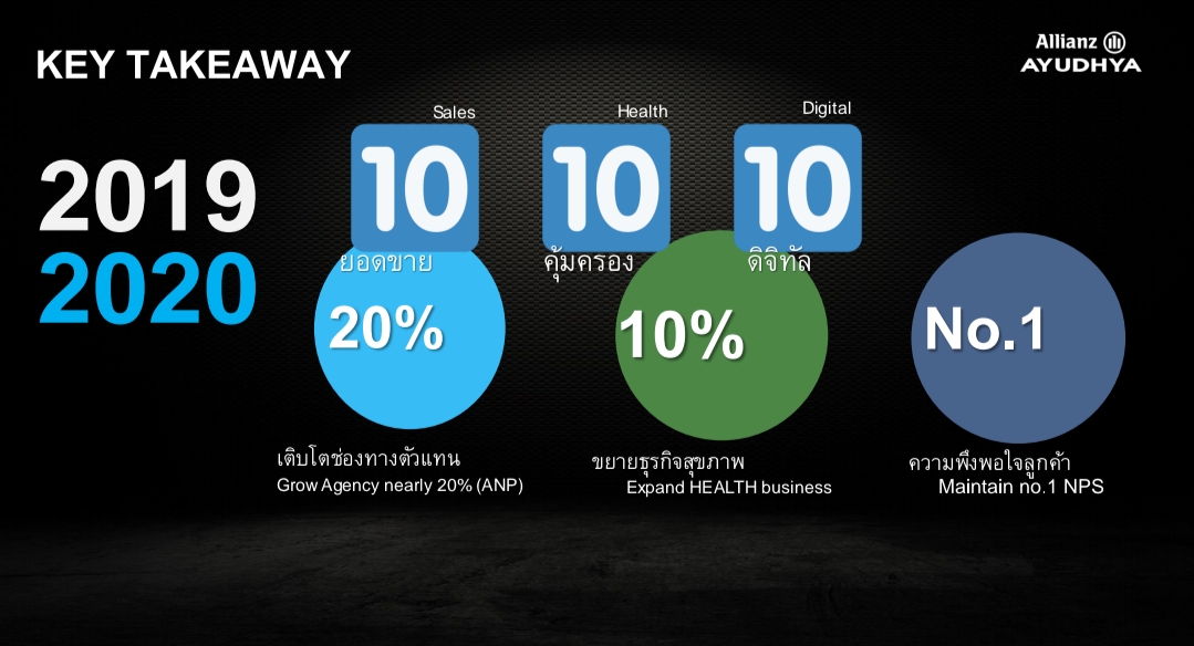 1. มุ่งสู่องค์กรดิจิทัล บริษัทฯยังคงเดินหน้านำเทคโนโลยีมาใช้ในการดำเนินงาน โดยมีเป้าหมายให้ตัวแทนหันมาใช้งาน Allianz Discover ให้ถึง 100% เทียบจากปีที่ผ่านมามีเพียง 76% นอกจากนั้นยังคงทำงานกับ BDMS ใกล้ชิดในเรื่องของ API เพื่อขยายไปยังการเคลมแบบผู้ป่วยใน ให้ขั้นตอนการเช็คเอาท์ออกจากโรงพยาบาลมีความรวดเร็วขึ้นภายใน 3 นาที จากเดิมใช้เวลา 30 นาที และยังมีเป้าหมายที่จะเพิ่มจำนวนสมาชิกของชุมชนออนไลน์ Healthy Living ให้ถึง 180,000 คนภายในปีนี้