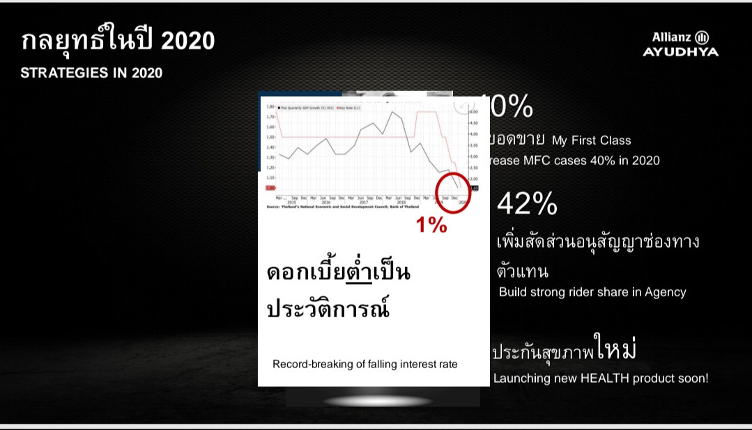 นายไบรอัน กล่าวต่อไปว่า สำหรับความท้าทายในปี 2563 ไม่ว่าจะเป็น ผลกระทบจากการเข้ามาของผู้เล่นดิจิทัล สภาวะดอกเบี้ยตกต่ำ สภาพเศรษฐกิจที่ชะลอตัว ซึ่งหนึ่งในนั้น เกิดจากการระบาดของไวรัส COVID-19 ถึงกระนั้น อลิอันซ์ อยุธยา ยังคงมุ่งสร้างการเติบโตของธุรกิจ โดยคาดว่าปีนี้จะมีเบี้ยประกันรับรวมที่ 33,000 ล้านบาท แบ่งเป็นการเติบโตจากช่องทางตัวแทน 2,900 ล้านบาท ขยายตัว 20% ส่วนช่องทางแบงก์แอสชัวรันส์อาจจะโตที่ 1,400 ล้านบาท ช่องทางขายตรง 1,700 ล้านบาท ยังคงเป็นเจ้าตลาด โดยรวมน่าจะมีเบี้ยประกันทุกช่องทางที่ 6,100 ล้านบาท