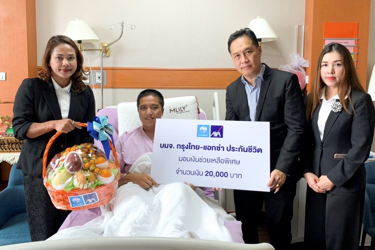 จ.นครราชสีมา 6 มีนาคม 2563 : บมจ.กรุงไทย-แอกซ่า ประกันชีวิต นำโดย พีระพงษ์ ชินวัตร (คนที่ 2 จากขวา) รองประธานอาวุโส – บริหารงานขาย ฝ่ายจัดจำหน่ายผ่านธนาคาร พร้อม อัณณ์ณิชญา โสภาคจิรังกุล (คนที่ 1 จากขวา) ผู้จัดการเขต งานสนับสนุน ช่องทางจัดจำหน่ายผ่านธนาคาร เขตเพชรบุรี เข้าเยี่ยม พ.ต.ต.ศตวรรษ คนชุม ผู้บาดเจ็บจากเหตุการณ์ที่จังหวัดนคราชสีมา พร้อมมอบกำลังใจ และเงินช่วยเหลือพิเศษ จำนวน 20,000 บาท ณ โรงพยาบาลตำรวจ ![]()