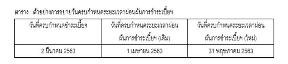 1. กรมธรรม์ที่ครบกำหนดระยะเวลาผ่อนผัน การชำระเบี้ยประกันภัย ตั้งแต่วันที่ 27 กุมภาพันธ์ 2563 ถึง วันที่ 30 เมษายน 2563 บริษัทฯขยายระยะเวลาผ่อนผันการชำระเบี้ยออกไปอีก 60 วัน นับแต่วันครบกำหนดระยะเวลาผ่อนผันเดิม