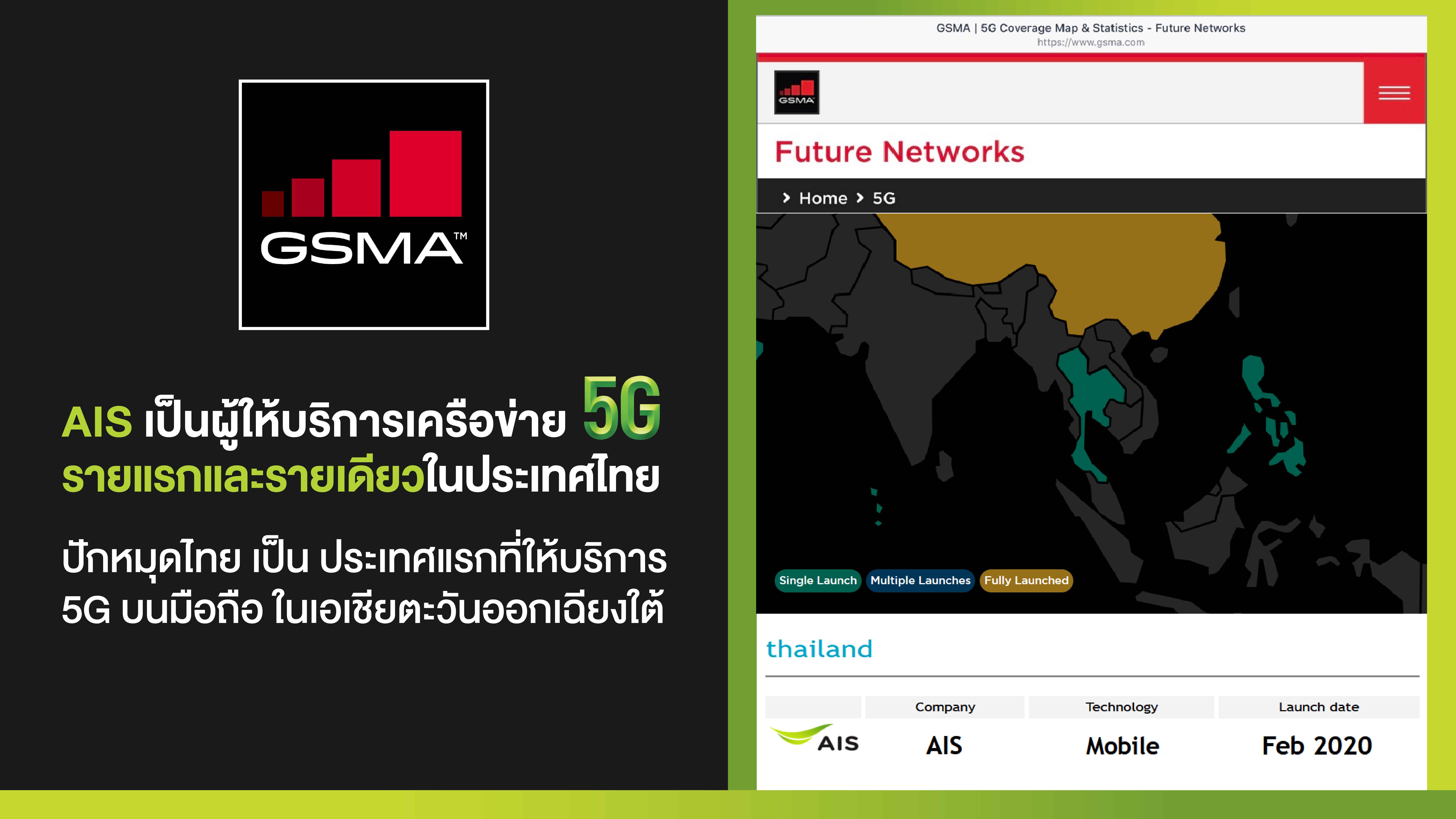 วันที่ 10 มีนาคม 2563 : นายปรัธนา ลีลพนัง หัวหน้าคณะผู้บริหารด้านการตลาด กลุ่มลูกค้าทั่วไป บริษัท แอดวานซ์ อินโฟร์ เซอร์วิส จำกัด (มหาชน) หรือ เอไอเอส กล่าวว่า “เรามีความยินดีเป็นอย่างยิ่ง ในโอกาสที่ GSMA สมาคมผู้ให้บริการเครือข่ายโทรคมนาคมที่มีสมาชิกมากกว่า 800 รายทั่วโลก ได้ประกาศรับรองให้ เอไอเอสเป็นผู้ให้บริการเครือข่าย 5G รายแรกและรายเดียวในประเทศไทย ที่พร้อมให้คนไทยได้ใช้บริการ 5G เชิงพาณิชย์ อย่างเป็นทางการแล้ว ถือเป็นการนำชื่อเสียงประเทศไทยสู่แวดวงโทรคมนาคมโลก ปักหมุดไทยเป็นประเทศแรกที่ให้บริการ 5G บนมือถือในเอเชียตะวันออกเฉียงใต้ได้สำเร็จ”