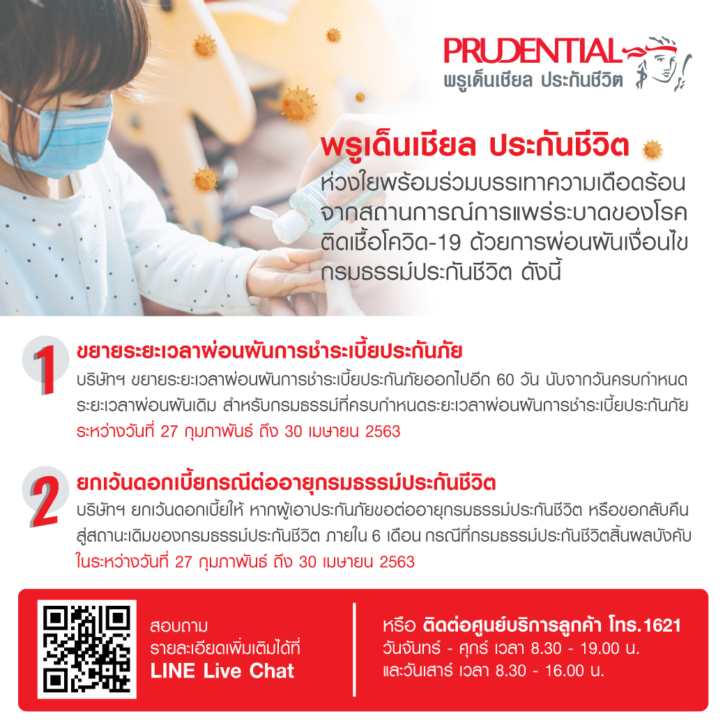 กรุงเทพฯ, ประเทศไทย, 10 มีนาคม 2563 : จากสถานการณ์การแพร่ระบาดของโรคติดเชื้อโควิด-19 (COVID-19) ในขณะนี้ บริษัท พรูเด็นเชียล ประกันชีวิต (ประเทศไทย) จำกัด (มหาชน) มีความห่วงใยลูกค้าและผู้เอาประกันภัยของบริษัทฯ ที่อาจได้รับผลกระทบจากสถานการณ์นี้ จึงขอร่วมเป็นกำลังใจและช่วยบรรเทาความเดือดร้อน ด้วยการผ่อนผันเงื่อนไขที่ได้กำหนดไว้ในกรมธรรม์ประกันชีวิต โดยมีรายละเอียดดังนี้