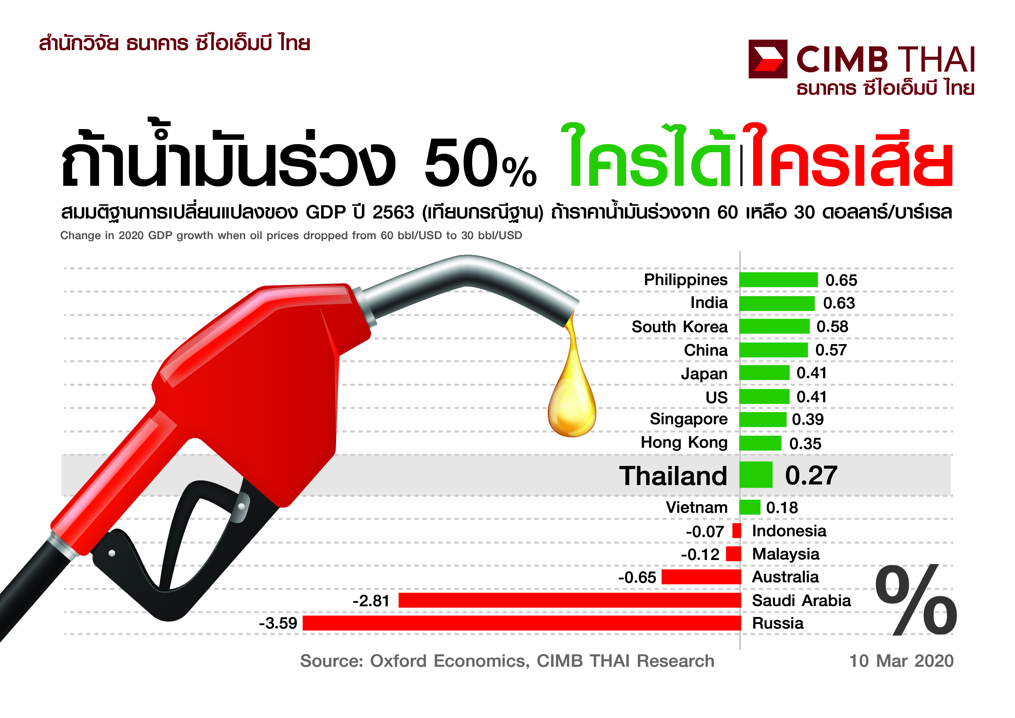สำนักวิจัยธนาคาร ซีไอเอ็มบี ไทย ได้ใช้โมเดลจากอ๊อกฟอร์ดอิโคโนมิกส์ คาดการณ์การเปลี่ยนแปลงของการเติบโตทางเศรษฐกิจ (GDP) ของประเทศสำคัญ (เทียบกับฐาน) กรณีราคาน้ำมันร่วงลง 50% พบว่า