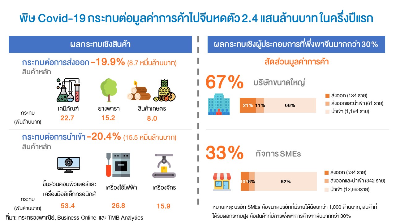 ศูนย์วิเคราะห์เศรษฐกิจ ทีเอ็มบี ประเมินผลกระทบต่อภาคการค้าไทย-จีนจากการที่รัฐบาลจีนใช้มาตรการเข้มงวดชัตดาวน์ประเทศเพื่อควบคุมการแพร่ระบาด จะทำให้ครึ่งปีแรกของปี 2563 มูลค่าการค้าไทยไปจีนลดลงราว 2.4 แสนล้านบาท หรือหดตัว 20% จากช่วงเดียวกันของปีก่อน คิดเป็น 1.6% ของมูลค่าการค้ารวม และประเมินว่าสถานการณ์การค้าไทยจะค่อยๆ ฟื้นตัวได้ประมาณครึ่งปีหลัง ตามการคาดการณ์การแพร่ระบาดของ Covid-19 ที่ค่อยๆ ลดความรุนแรงลง