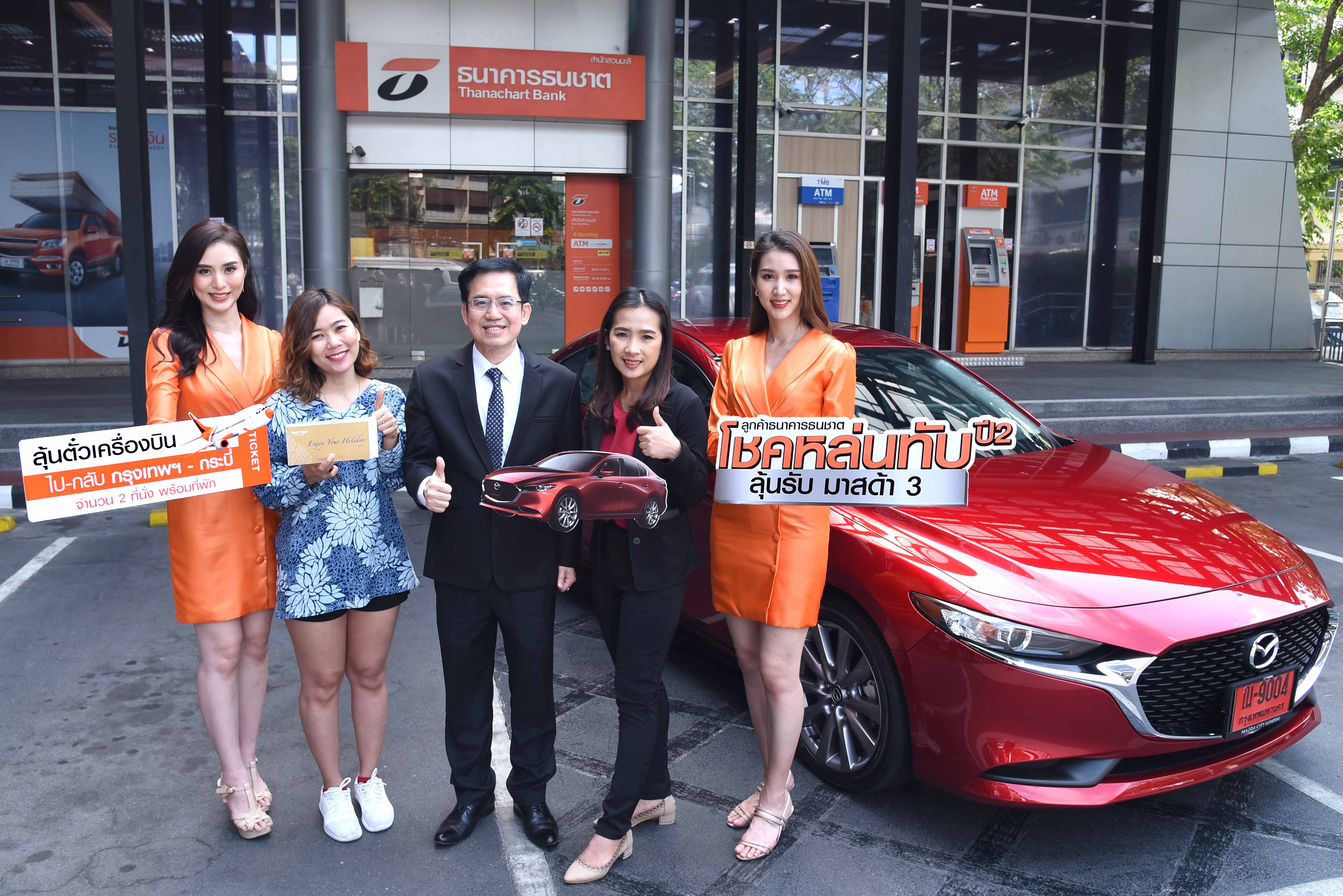 16 มีนาคม 2563 : อนุวัติร์ เหลืองทวีกุล รองกรรมการผู้จัดการ ธุรกิจลูกค้ารายย่อย ธนาคารธนชาต จำกัด (มหาชน) มอบรางวัลใหญ่ รถยนต์มาสด้า 3 รุ่น 2.0 S มูลค่า 1,069,000 บาท ให้กับ อภิญญา ยังเกิด (ที่ 2 จากขวา) ผู้โชคดีในแคมเปญ “โชคหล่นทับ ปี2” ที่เดินทางจาก จ.เพชรบุรี มารับรางวัลด้วยตัวเองที่ธนาคารธนชาต สำนักสวนมะลิ