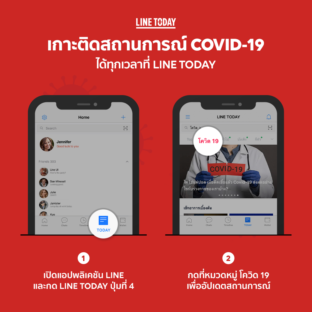 19 มีนาคม 256 : จากสถานการณ์การระบาดของไวรัสโคโรนา 2019 (COVID-19) ที่ขณะนี้เป็นปัญหาครอบคลุมทั่วโลก ซึ่งในประเทศไทยก็มีการแพร่กระจายเป็นวงกว้างมากขึ้น มีจำนวนผู้ติดเชื้อเพิ่มสูงขึ้น ทำให้ต้องมีการติดตามข้อมูลข่าวสารจากแหล่งที่น่าเชื่อถืออยู่อย่างต่อเนื่อง LINE TODAY เป็นช่องทางที่รวบรวมความเคลื่อนไหวจากแหล่งข่าวและแหล่งข้อมูลต่าง ๆ มาโดยตลอด และต่อจากนี้ LINE TODAY พร้อมอำนวยความสะดวก ด้วยการเพิ่มแถบเมนู “โควิด 19” หรือ https://lin.ee/iQ1iRUB/vjky/PR เพื่อการเข้าถึงข้อมูลอย่างสะดวก รวดเร็ว ทันต่อทุกสถานการณ์ เพื่อประสิทธิภาพสูงสุดที่ผู้ใช้ LINE จะรู้เท่าทัน ตลอดจนป้องกันและปรับตัวได้อย่างเหมาะสมในสภาวะปัจจุบัน
