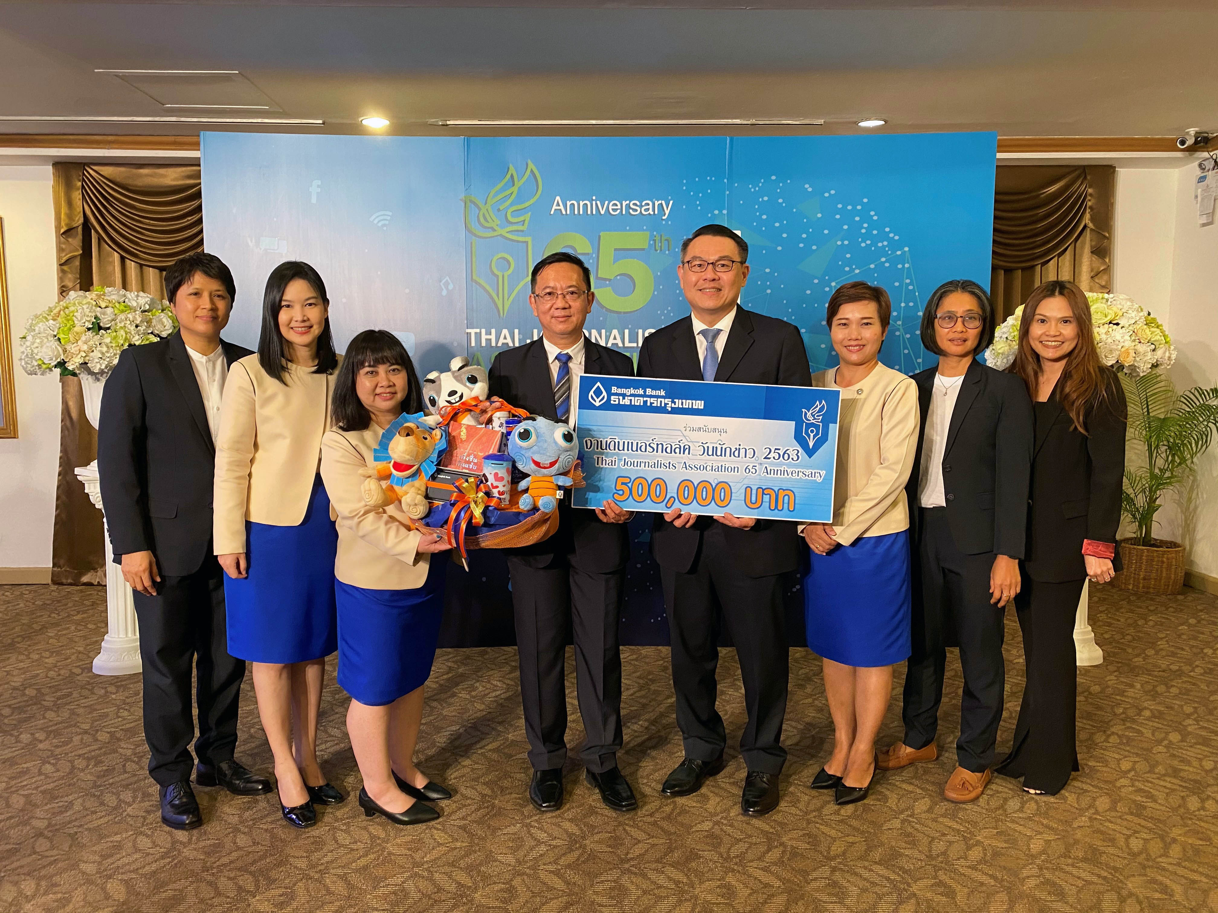 19 มีนาคม 2563 : อภิวัฒน์ ปุณโณปกรณ์ (ที่ 4 จากขวา) เจ้าหน้าที่บริหารระดับ Vice President ฝ่ายการประชาสัมพันธ์ ธนาคารกรุงเทพ จำกัด (มหาชน) ร่วมแสดงความยินดีกับ มงคล บางประภา (ที่ 4 จากซ้าย) และคณะกรรมการบริหารสมาคมนักข่าวนักหนังสือพิมพ์แห่งประเทศไทย ประจำปี 2563 พร้อมมอบเงินจำนวน 500,000 บาท (ห้าแสนบาทถ้วน) สนับสนุนการจัดงานดินเนอร์ทอล์ค วันนักข่าวประจำปี 2563 เนื่องในโอกาสครบรอบ 65 ปี ของสมาคมฯ (‘Thai Journalists Association 65th Anniversary’)