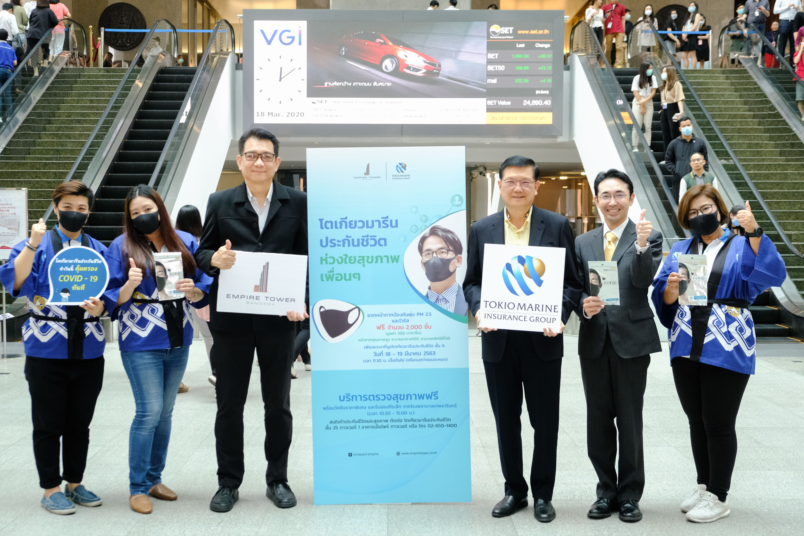 20 มีนาคม 2563 : จากสถานการณ์การแพร่ระบาดจากเชื้อโควิท-19 ส่งผลให้หน้ากากป้องกันเชื้อไวรัสเกิดความขาดแคลน บมจ.โตเกียวมารีนประกันชีวิต (ประเทศไทย) ร่วมกับอาคารเอ็มไพร์ ห่วงใยสุขภาพพนักงาน ผู้เช่าในอาคารเอ็มไพร์ จัดกิจกรรมแจกหน้ากากป้องกันไวรัส โควิด-19 ฟรีกว่า 2,500 ชิ้น โดยได้รับเกียรติจาก สมโพชน์ เกียรติไกรวัล รองประธานเจ้าหน้าที่บริหาร และ โตโยทาเกะ คูวาตะ ผู้อำนวยการอาวุโส –ที่ปรึกษาฝ่ายบริหาร บมจ. โตเกียวมารีนประกันชีวิต (ประเทศไทย) ร่วมมอบหน้ากาก