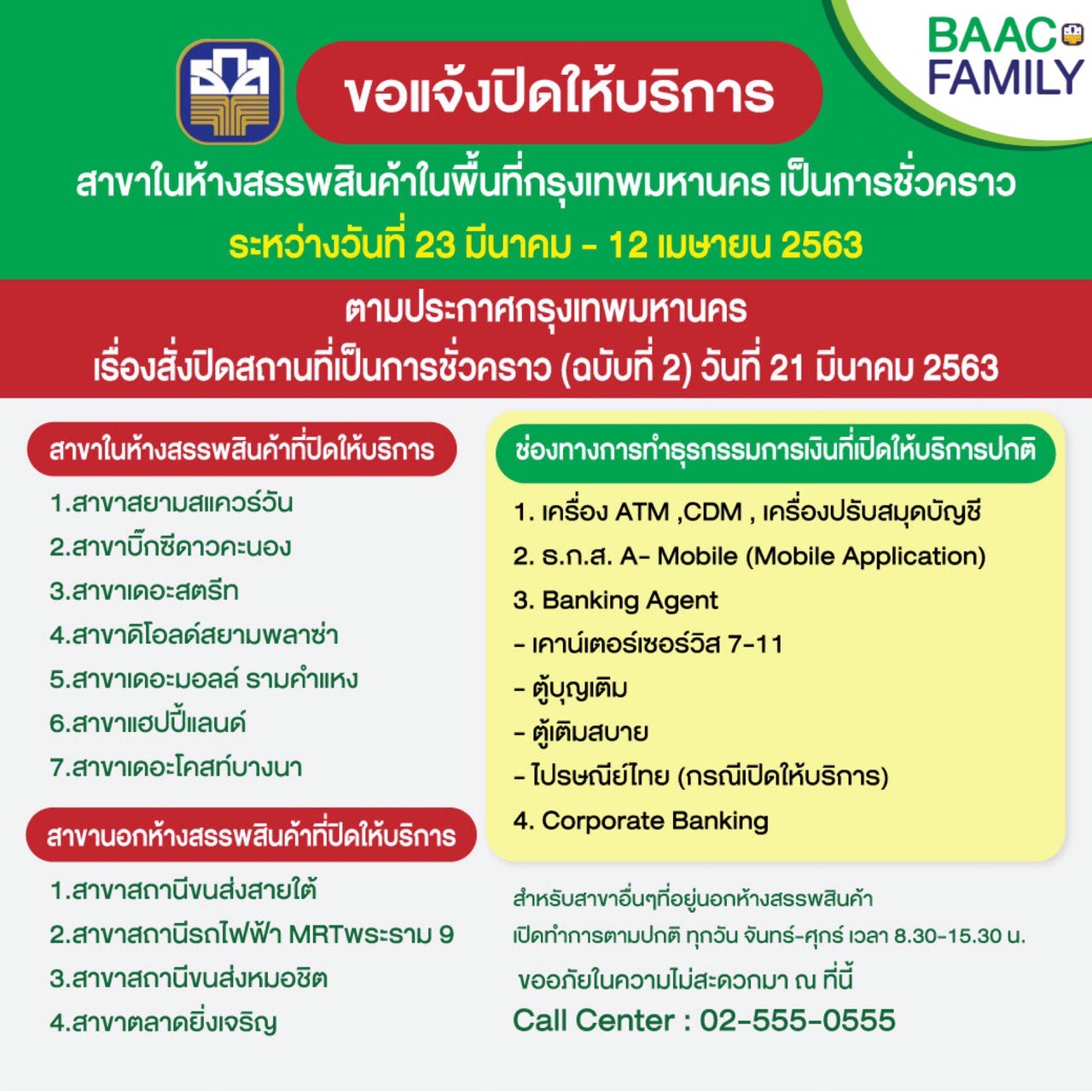ด้แก่ สาขาสยามสแควร์วัน บิ๊กซีดาวคะนอง เดาะสตรีท ดิโอลด์สยามพลาซ่า เดอะมอลล์ รามคำแหง แฮปปี้แลนด์ เดอะโคสท์บางนา สถานีขนส่งสายใต้ สถานีรถไฟฟ้า MRT พระราม 9 ขนส่งหมอชิต และตลาดยิ่งเจริญ ตั้งแต่บัดนี้ ถึง 12 เมษายน 2563 (หรือจนกว่าจะมีประกาศเปลี่ยนแปลง) ทั้งนี้ ลูกค้าสามารถทำธุรกรรมผ่านช่องทางแอปพลิเคชันธ.ก.ส. A-Mobile เครื่อง ATM CDM เครื่องปรับสมุดบัญชี Banking Agent ทางเคาน์เตอร์เซอร์วิสในร้าน 7-Eleven ตู้บุญเติม ตู้เติมสบาย ไปรษณีย์ไทยได้ตามปกติ หรือใช้บริการได้ที่สาขาอื่น ๆ ในพื้นที่ใกล้เคียง โดยสามารถค้นหาที่ตั้งของสาขาที่เปิดให้บริการได้ทางเว็บไซต์ www.baac.or.th หรือสอบถามข้อมูลการให้บริการอื่น ๆ ได้ทางCall Center 02 555 0555