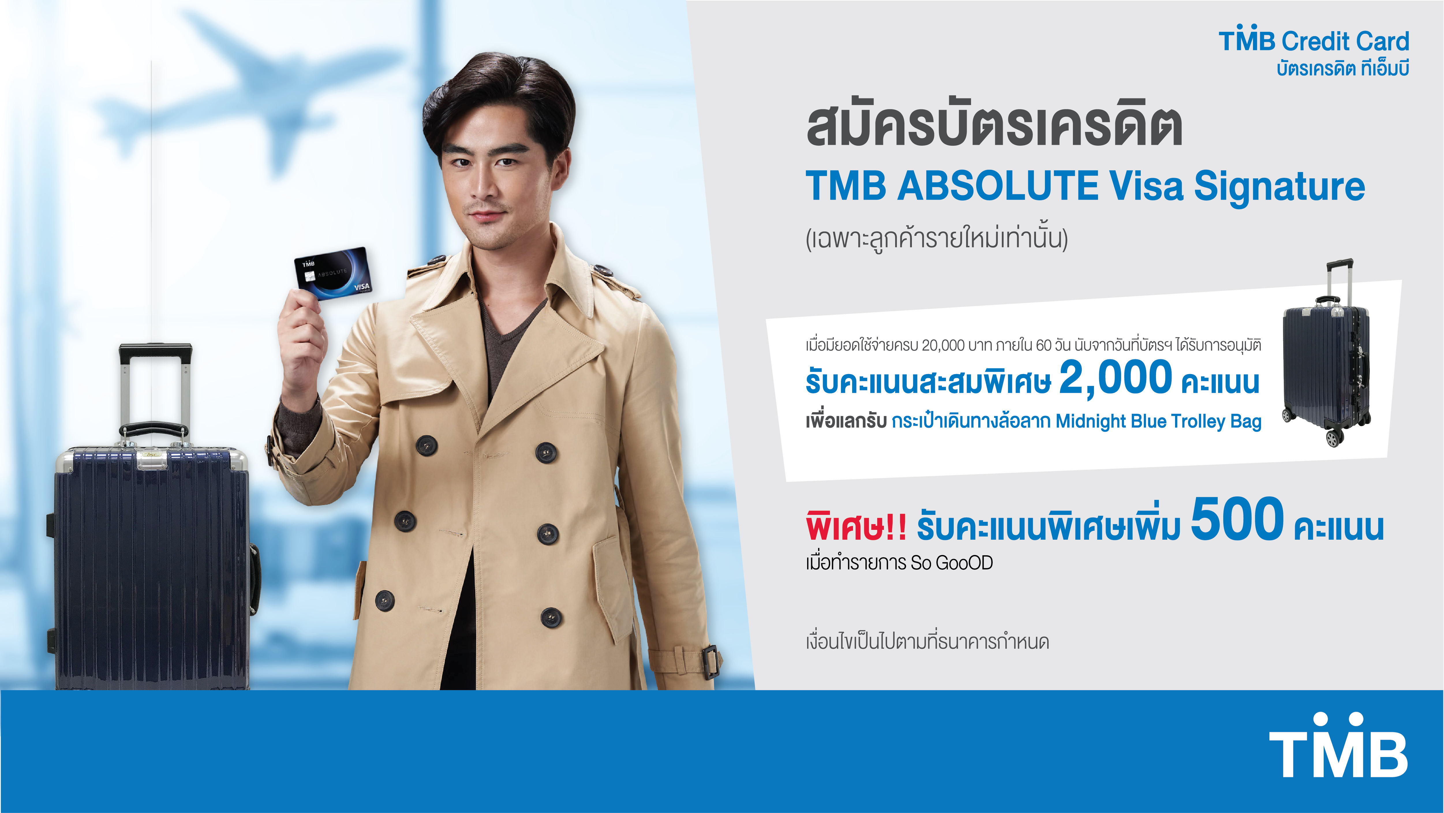 23 มีนาคม 2563 : บัตรเครดิต TMB มอบสิทธิประโยชน์แก่ผู้ถือบัตรเครดิตรายใหม่ TMB Absolute Visa Signature เมื่อสมัครและใช้จ่ายผ่านบัตรครบ 20,000 บาท ภายใน 60 วัน นับจากวันที่บัตรเครดิตได้รับการอนุมัติ รับคะแนนพิเศษ 2,000 คะแนน เพื่อแลกรับกระเป๋าเดินทาง BSC Midnight Blue Trolley Bag ขนาด 20 นิ้ว มูลค่า 5,990 บาท และรับคะแนนเพิ่ม 500 คะแนน เมื่อทำรายการ So GooOD 1 ครั้ง ตั้งแต่วันนี้ – 31 พ.ค. 2563 สอบถามรายละเอียดเพิ่มเติมที่ TMB Contact Center โทร. 1558 หรือดูรายละเอียดเพิ่มเติมที่ www.tmbbank.com ![]()