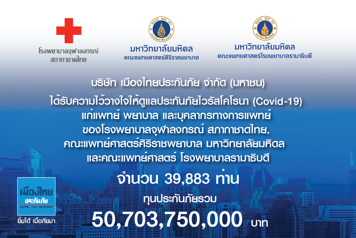 24 มีนาคม 2563 : เมืองไทยประกันภัย ได้รับความไว้วางใจให้ดูแลประกันภัยไวรัสโคโรนา (Covid-19) ให้แก่ 3 โรงพยาบาลใหญ่ของไทย คือ โรงพยาบาลจุฬาลงกรณ์ สภากาชาดไทย, คณะแพทย์ศาสตร์ศิริราชพยาบาล มหาวิทยาลัยมหิดล และคณะแพทย์ศาสตร์ โรงพยาบาลรามาธิบดี รวมจำนวนกว่า 39,883 คน ทุนประกันภัยรวมกว่า 50,703,750,000 ล้านบาท