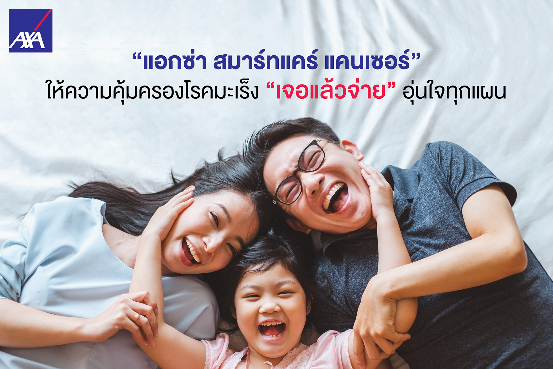 26 มีนาคม 2563 : บริษัท แอกซ่าประกันภัย จำกัด (มหาชน) ชวนคนไทยหันมาใส่ใจดูแลสุขภาพผ่านแผนประกันสุขภาพ “แอกซ่า สมาร์ทแคร์ แคนเซอร์” ที่ให้ความคุ้มครองโรคมะเร็งทุกชนิด ทุกระยะ “เจอแล้วจ่าย” ด้วยทุนประกันภัยสูงสุดถึง 900,000 บาท* ไม่ต้องตรวจสุขภาพ ที่สำคัญยังคุ้มครองบุตรอายุ 1-22 ปีที่ยังไม่ได้สมรส และไม่จำกัดจำนวนบุตรฟรี* รวมถึงขยายความคุ้มครองโรคมะเร็งผิวหนัง 20%* ของทุนประกัน