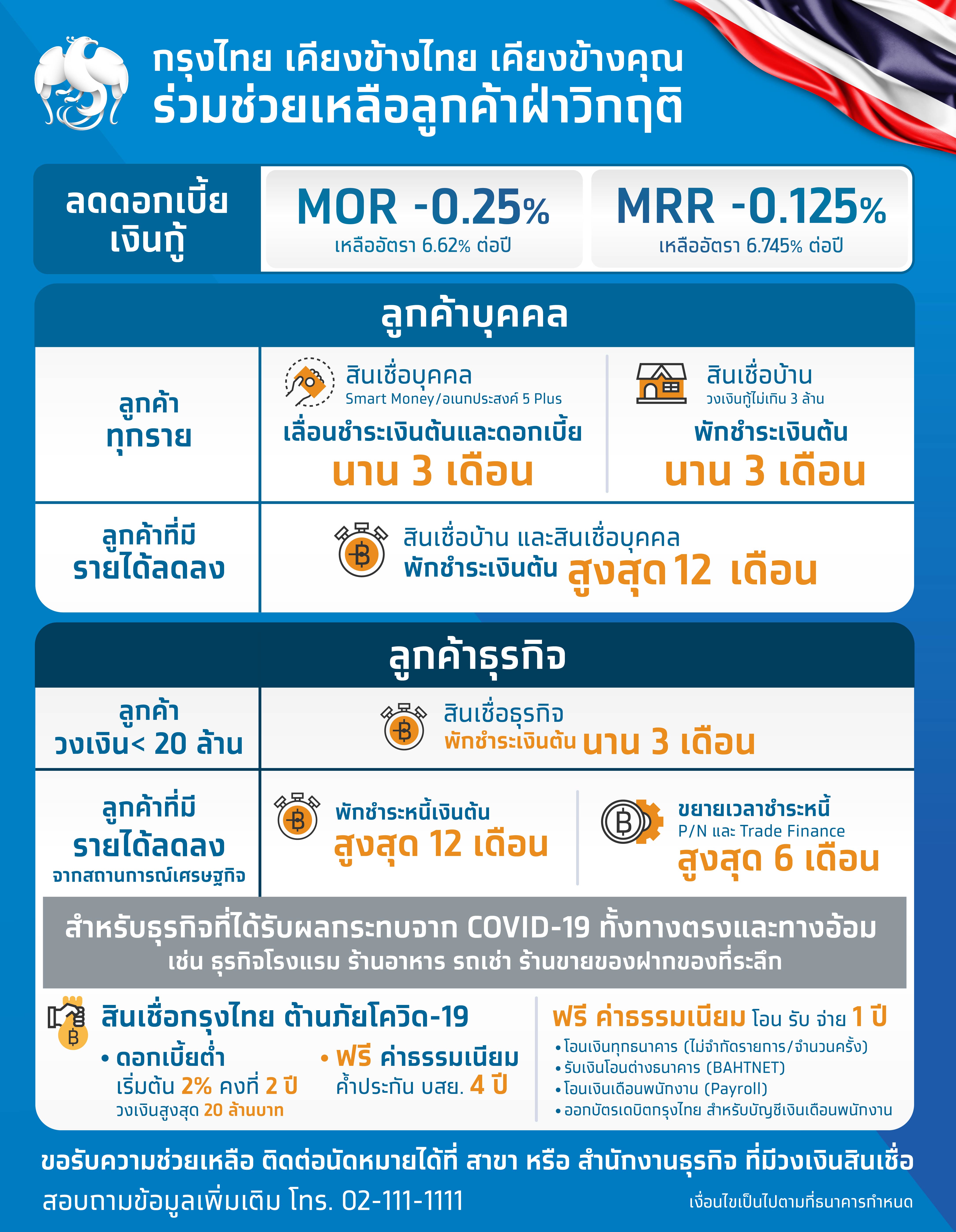 ทั้งนี้ลูกค้าสามารถติดต่อขอรับความช่วยเหลือได้ที่สาขา และสำนักงานธุรกิจที่มีวงเงินสินเชื่ออยู่ หรือสอบถามข้อมูลเพิ่มเติมที่ Krungthai Contact Center 02-111-1111 ![]()