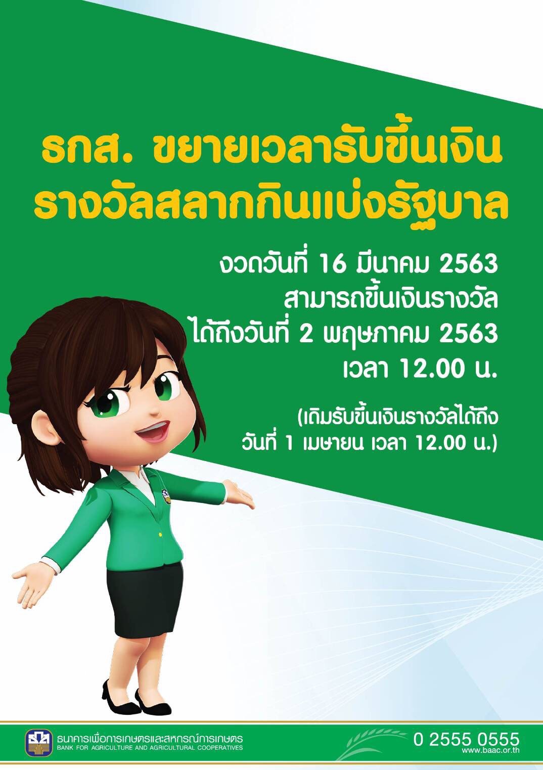 ธ.ก.ส. ในฐานะหน่วยงานที่ให้บริการจ่ายเงินรางวัลสลากกินแบ่งรัฐบาล ขอแจ้งขยายเวลาให้บริการจ่ายเงินสลากฯ ผ่านเคาน์เตอร์สาขาของธนาคาร ของงวดวันที่ 16 มีนาคม 2563 จากเดิม สิ้นสุดการให้บริการจ่ายเงินรางวัลฯในวันที่ 1 เมษายน 2563 เวลา 12.00 น. เป็น วันที่ 2 พฤษภาคม 2563 เวลา 12.00 น. เนื่องจากสำนักงานสลากกินแบ่งรัฐบาลเปลี่ยนแปลงวันออกรางวัลสลากกินแบ่งรัฐบาลงวดวันที่ 1 เมษายน 2563 เป็นวันที่ 2 พฤษภาคม 2563 ทำให้การให้บริการจ่ายเงินรางวัลงวดปัจจุบันขยายเวลาถึงช่วงเวลาดังกล่าว โดยสามารถสอบถามรายละเอียดเพิ่มเติมได้ที่ Call Center 02 555 0555 ![]()