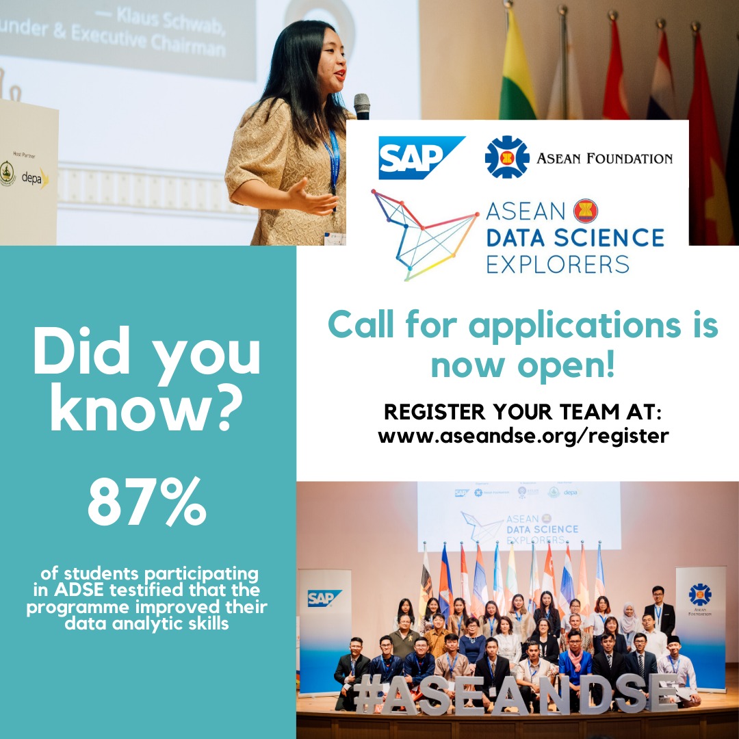 30 มีนาคม 2563 : มูลนิธิอาเซียน และ เอสเอพี เปิดรับสมัครผู้เข้าร่วมการแข่งขัน “อาเซียน ดาต้า ไซเอนซ์ เอ็กซ์พลอเรอส์” (ASEAN Data Science Explorers : ASEANDSE) ประจำปี 2563 เชิญชวนนักศึกษาอายุตั้งแต่ 16 ปีขึ้นไป ในระดับอุดมศึกษาจากทั่วภูมิภาคอาเซียน ก้าวสู่บทบาทนักแก้ไขปัญหาทางสังคมรุ่นใหม่ โดยใช้ข้อมูลเชิงลึกเป็นเครื่องมือ