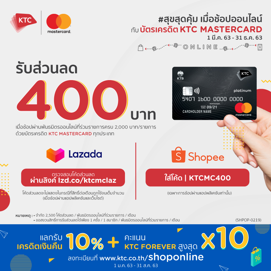31 มีนาคม 2563 : “เคทีซี” หรือ บริษัท บัตรกรุงไทย จำกัด (มหาชน) ผนึก 3 พันธมิตร มอบ #สุขสุดคุ้ม เมื่อช้อปสินค้าออนไลน์ผ่านบัตรเครดิตเคทีซี มาสเตอร์การ์ด ทุกประเภทครบ 2,000 บาทต่อรายการ ผ่านแอปฯ Shopee และใส่โค้ด “KTCMC400” หรือแอปฯ LAZADA และเว็บไซต์ www.lazada.co.th พร้อมใส่โค้ดที่ระบุ โดยสามารถตรวจสอบโค้ดส่วนลดผ่านลิงค์ lzd.co/ktcmclaz (แถบพาร์ทเนอร์ชิพ) รับส่วนลดทันที 400 บาท ตั้งแต่วันที่ 1 มีนาคม 2563 – 31 ธันวาคม 2563 จำกัด 2,500 โค้ดต่อเดือนต่อพันธมิตร พิเศษ ใช้คะแนน KTC FOREVER เท่ากับยอดใช้จ่ายออนไลน์ต่อรายการ แลกรับเครดิตเงินคืนอีก 10% พร้อมรับคะแนน KTC FOREVER สูงสุด 10 เท่า (คะแนนปกติ 1 เท่า + คะแนนพิเศษ 9 เท่า) ตั้งแต่วันที่ 1 มกราคม 2563 – 31 สิงหาคม 2563 โดยลงทะเบียนแลกรับสิทธิพิเศษ หรือสอบถามรายละเอียดเพิ่มเติมได้ที่ www.ktc.co.th/shoponline แหล่งรวมโค้ดส่วนลดจากพันธมิตรออนไลน์มากที่สุด