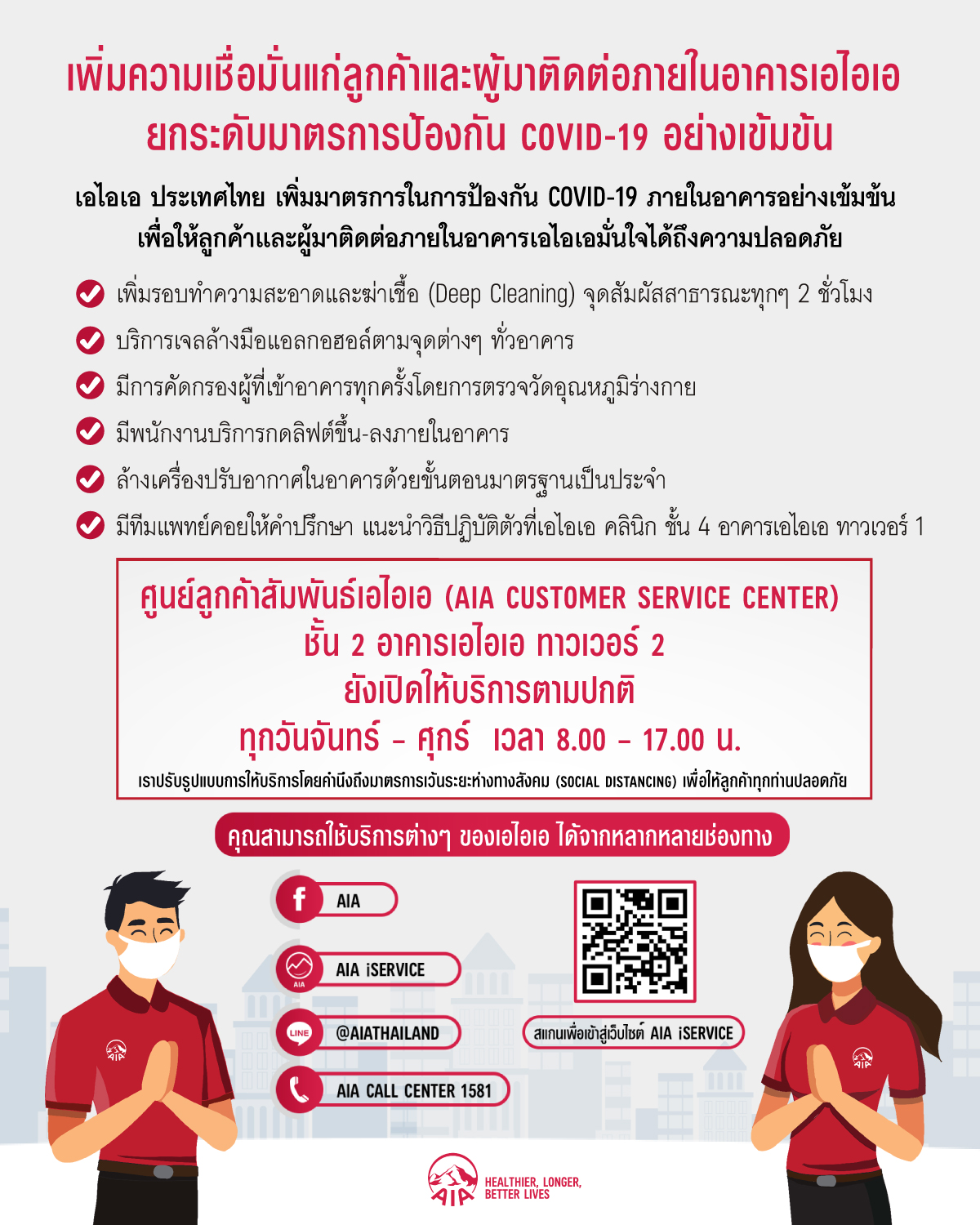 อย่างไรก็ตาม สำหรับผู้ต้องการเข้ามาติดต่อเพื่อทำธุรกรรมด้านการประกันภัย ยังคงสามารถเข้ามาใช้บริการที่ศูนย์ลูกค้าสัมพันธ์เอไอเอ (AIA Customer Service Center) ชั้น 2 อาคารเอไอเอ ทาวเวอร์ 2 ได้ทุกวันจันทร์ – ศุกร์ ตั้งแต่เวลา 8.00 – 17.00 น. ซึ่งได้ทำการปรับรูปแบบการให้บริการที่ศูนย์ลูกค้าสัมพันธ์เอไอเอ โดยคำนึงถึงมาตรการเว้นระยะห่างทางสังคม (Social Distancing) เพื่อให้ลูกค้าทุกท่านปลอดภัยจากโรคโควิด-19