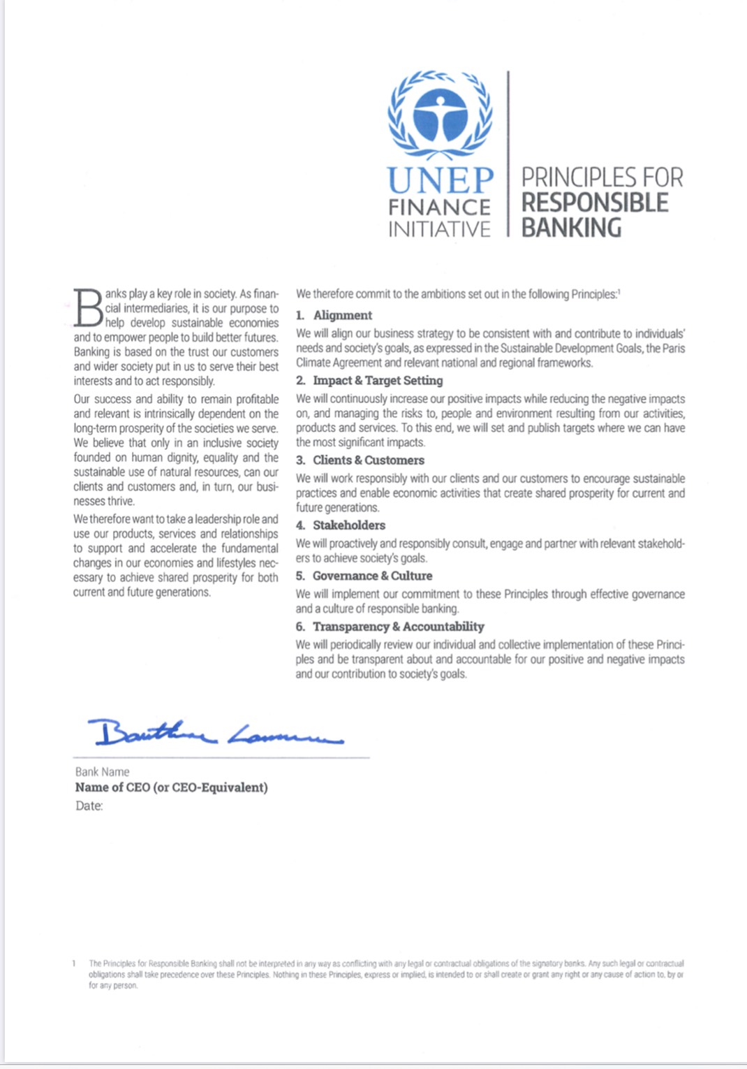 ดังนั้น เพื่อประกาศเจตนารมย์ถึงความมุ่งมั่นของธนาคารในการขับเคลื่อนธุรกิจในทิศทางดังกล่าวและพัฒนาอย่างยั่งยืนตามมาตรฐานสากล ธนาคารกสิกรไทยจึงได้ตอบรับเข้าร่วมใน “หลักการธนาคารที่รับผิดชอบ” (UN Principles for Responsible Banking) ของสำนักงานโครงการสิ่งแวดล้อมแห่งสหประชาชาติว่าด้วยข้อริเริ่มด้านการเงิน (United Nations Environmental Program Finance Initiative) หรือ UNEP FI นับเป็นธนาคารสัญชาติไทยแห่งแรกและแห่งเดียวในธนาคารกว่า 170 แห่งทั่วโลกที่เข้าร่วมในหลักการดังกล่าว ซึ่งประกอบด้วยหลักการ 6 ประการ ได้แก่