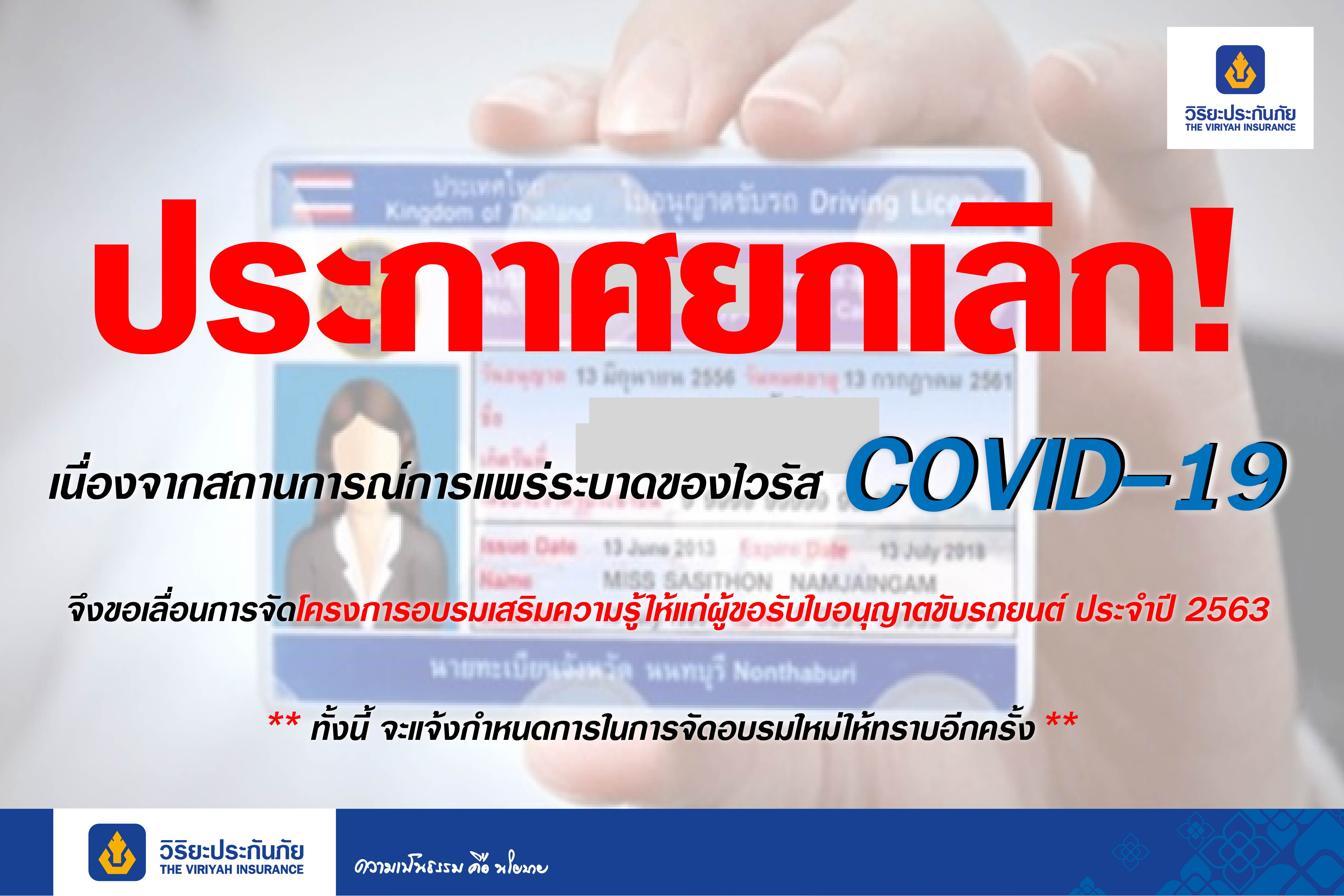31 มีนาคม 2563 : เนื่องด้วยสถานการณ์การแพร่ระบาดของเชื้อไวรัสโควิด-19 ซึ่งอยู่ระหว่างการเฝ้าระวังและป้องกันการแพร่ระบาดตามนโยบายของรัฐบาล บริษัท วิริยะประกันภัย จำกัด (มหาชน) มีความตระหนักถึงความปลอดภัยทางด้านสุขภาพของประชาขน จึงมีความจำเป็นต้องขอประกาศเลื่อนการจัด “โครงการอบรมเสริมความรู้ให้แก่ผู้ขอรับใบอนุญาตขับรถยนต์” ประจำปี 2563