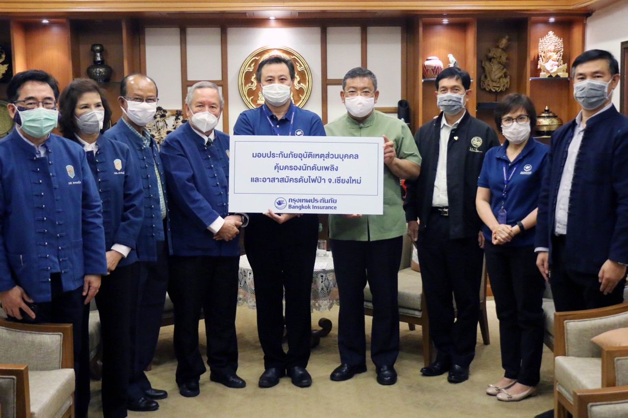 02 เมษายน 2563 : บริษัท กรุงเทพประกันภัย จำกัด (มหาชน) หรือ BKI ห่วงใยผู้ดูแลรักษาผืนป่า โดย อลงกรณ์ กาศทิพย์ (ยืนกลาง) ผู้จัดการภาคเหนือ ธุรกิจสาขาและการร่วมทุน เป็นผู้แทนบริษัทฯ มอบกรมธรรม์ประกันอุบัติเหตุกลุ่ม ให้แก่นักดับเพลิงและอาสาสมัครเชียงใหม่ จำนวน 3,300 คน ที่ปฏิบัติหน้าที่ในเหตุการณ์ไฟไหม้ป่าในพื้นที่จังหวัดเชียงใหม่ซึ่งกำลังวิกฤติอยู่ในขณะนี้ ด้วยทุนประกันภัยรวมทั้งสิ้น 1,650,000,000 บาท