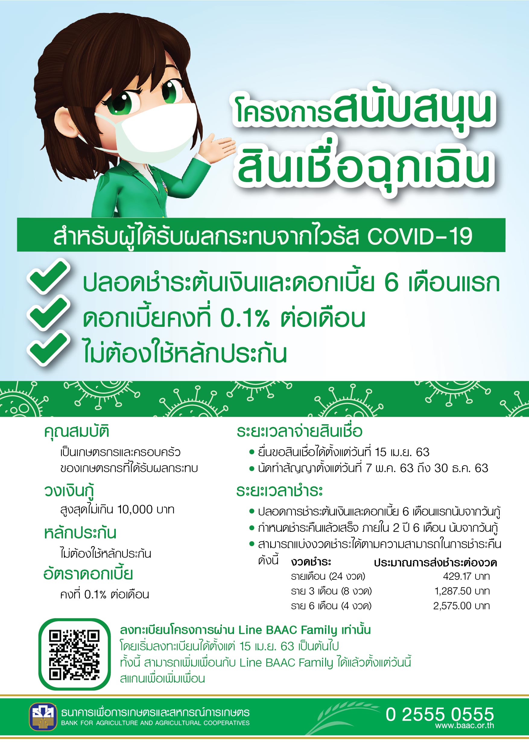 ทั้งนี้ ธนาคารเปิดรับลงทะเบียนเข้าร่วมโครงการฯ ผ่านช่องทาง LINE BAAC Family โดยสามารถเพิ่มเพื่อนด้วยการสแกน QR Code หรือค้นหาเพื่อนด้วย ID : @baacfamily ได้ตั้งแต่บัดนี้เป็นต้นไป และเริ่มลงทะเบียน พร้อมกันในวันที่ 15 เมษายน 2563 เป็นต้นไป และเมื่อเข้าสู่การลงทะเบียนตามช่องทางข้างต้นแล้ว กดเลือกเมนู “COVID-19” และกรอกรายละเอียดตามเมนูที่กำหนด โดยรอรับนัดหมายจากธนาคารทาง SMS พร้อมเตรียมหลักฐาน บัตรประชาชน สำเนา บัตรประชาชน กรณียังไม่ได้เป็นลูกค้า ธ.ก.ส. มาก่อน เบอร์โทรศัพท์มือถือของตนเองและข้อมูลบุคคลอื่นที่ติดต่อแทนได้ เมื่อนัดหมายทำสัญญา และผ่านขั้นตอนการพิจารณาอนุมัติสินเชื่อแล้ว ธนาคารจะส่ง SMS แจ้งผล กรณีอนุมัติจะโอนเงิน เข้าบัญชีเงินฝากโดยตรงภายใน 1 วัน และท่านสามารถถอนเงินสดผ่านตู้ ATM โดยใช้บัตร ATM บัตรเดบิต หรือบริการ กดเงินไม่ใช้บัตรผ่านแอปพลิเคชัน ธ.ก.ส. A-Mobile