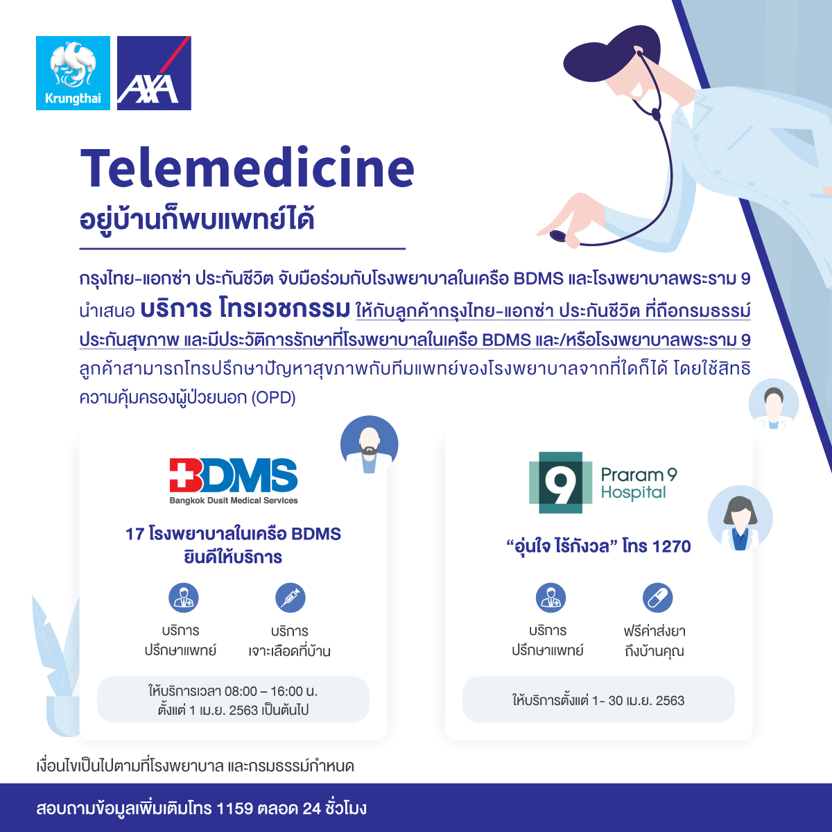 03 เมษายน 2563 : บมจ.กรุงไทย-แอกซ่า ประกันชีวิต ร่วมกับโรงพยาบาลในเครือ BDMS และโรงพยาบาลพระราม 9 ให้บริการรูปแบบใหม่ “Telemedicine อยู่บ้านก็พบแพทย์ได้” ที่เพิ่มความสะดวกสบาย ให้แก่ลูกค้า โดยบริการดังกล่าวมอบให้กับลูกค้าผู้ถือกรมธรรม์ประกันสุขภาพ ของ บมจ.กรุงไทย–แอกซ่า ประกันชีวิต และมีประวัติการรักษาที่โรงพยาบาลในเครือ BDMS และ/หรือ โรงพยาบาลพระราม 9