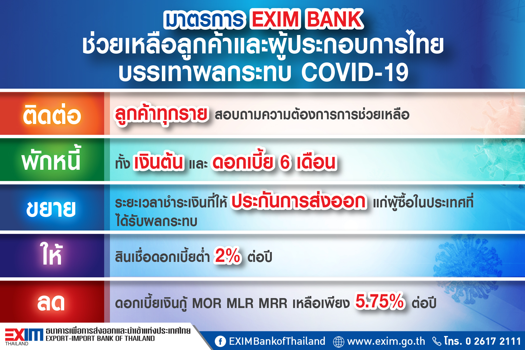 “EXIM BANK ได้ติดตามสถานการณ์อย่างใกล้ชิดและติดต่อไปยังลูกค้าทุกรายของธนาคาร เพื่อสอบถามความต้องการการสนับสนุนหรือความช่วยเหลือจากธนาคาร รวมทั้งได้ออกมาตรการช่วยเหลือลูกค้าและผู้ประกอบการไทย รวมทั้ง SMEs มาอย่างต่อเนื่อง เพื่อบรรเทาผลกระทบของโควิด-19 ต่อภาคธุรกิจและเศรษฐกิจไทย นอกเหนือจากการนำร่องปรับลดอัตราดอกเบี้ยเงินกู้ MOR MLR และ MRR หรือ Prime Rate