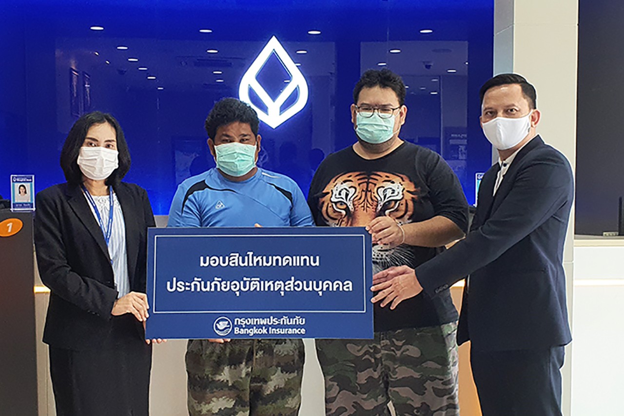 07 เมษายน 2563 : บริษัท กรุงเทพประกันภัย จำกัด (มหาชน) หรือ BKI โดย ปาริชาต อนุชิตชาตรี (ซ้ายสุด) ผู้จัดการสาขาร้อยเอ็ด ธุรกิจสาขาและการร่วมทุน เป็นผู้แทนบริษัทฯ มอบสินไหมทดแทนประกันภัยอุบัติเหตุส่วนบุคคล จำนวน 740,000 บาท (เจ็ดแสนสี่หมื่นบาทถ้วน) ให้แก่ พจนาท แสนนุภาพ และธีรนาท แสนนุภาพ ผู้รับประโยชน์ ซึ่งเป็นบุตรของ ลักษณ์ แสนนุภาพ ผู้เอาประกันภัยที่ประสบอุบัติเหตุเสียชีวิต