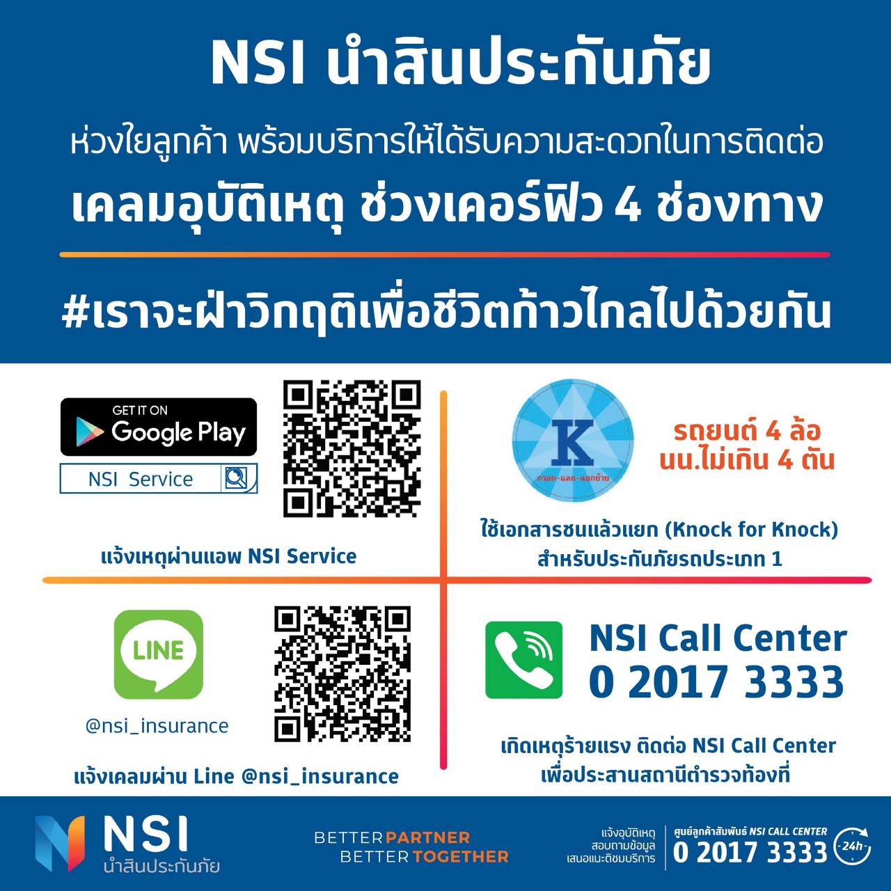 โดยเปิดช่องทางบริการรับแจ้งเคลมผ่านระบบออนไลน์อื่นๆ เพิ่มเติม นอกเหนือจากการโทรแจ้งเคลมในช่องทาง NSI call center หมายเลข 0 2017 3333 แล้วยังเปิดช่องทางอื่นอีกเช่น โทรแจ้งเหตุผ่านช่องทางไลน์ออฟฟิเชี่ยล @nsi_insurance และ ใช้แอพพลิเคชั่น NSI Service (สำหรับมือถือระบบแอนดรอยด์ทุกยี่ห้อ)