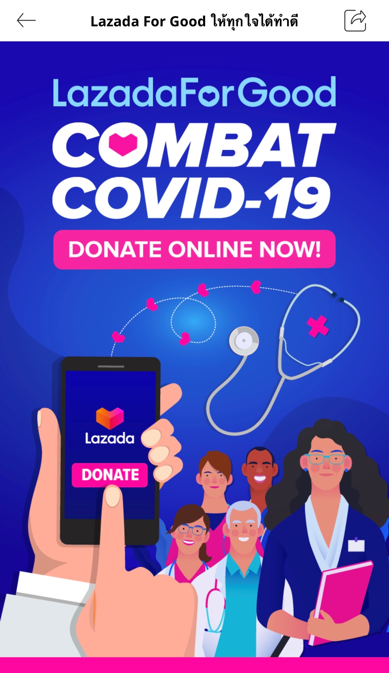 นอกจากนี้ลาซาด้ายังใช้เทคโนโลยีและแพลตฟอร์มของลาซาด้า เพื่ออำนวยความสะดวกให้แก่ผู้ที่ต้องการบริจาคให้กับโรงพยาบาลและมูลนิธิต่างๆ ลาซาด้าขอเป็นกำลังใจให้ประเทศไทยก้าวผ่านวิกฤตโรคระบาดนี้ไปด้วยกัน และขอเชิญชวนให้ทุกคนร่วมมือร่วมใจกันเพื่อหยุดการแพร่ระบาดของโรค”