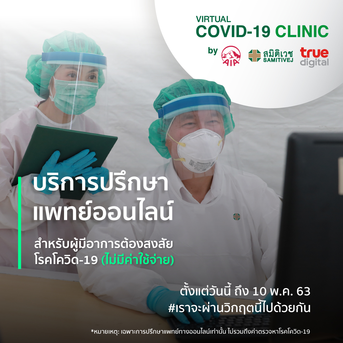 เอไอเอ ประเทศไทย เราเล็งเห็นถึงความเดือดร้อนของคนไทยทั่วประเทศ จึงเกิดเป็นความร่วมมือกันระหว่างเอไอเอ ประเทศไทย ผู้นำด้านนวัตกรรมและเทคโนโลยีครบวงจร อย่าง ทรู ดิจิทัล กรุ๊ป และโรงพยาบาลชั้นนำ อย่างเครือโรงพยาบาลสมิติเวช เปิดให้บริการ Virtual COVID-19 Clinic เพื่อให้ผู้ที่มีอาการต้องสงสัยโรคโควิด-19 สามารถขอรับคำปรึกษาจากทีมแพทย์ผู้เชี่ยวชาญของเครือโรงพยาบาลสมิติเวชได้ โดยไม่ต้องมีค่าใช้จ่าย ผ่านเว็บไซต์ https://smtvj.com/2R2RXUt”