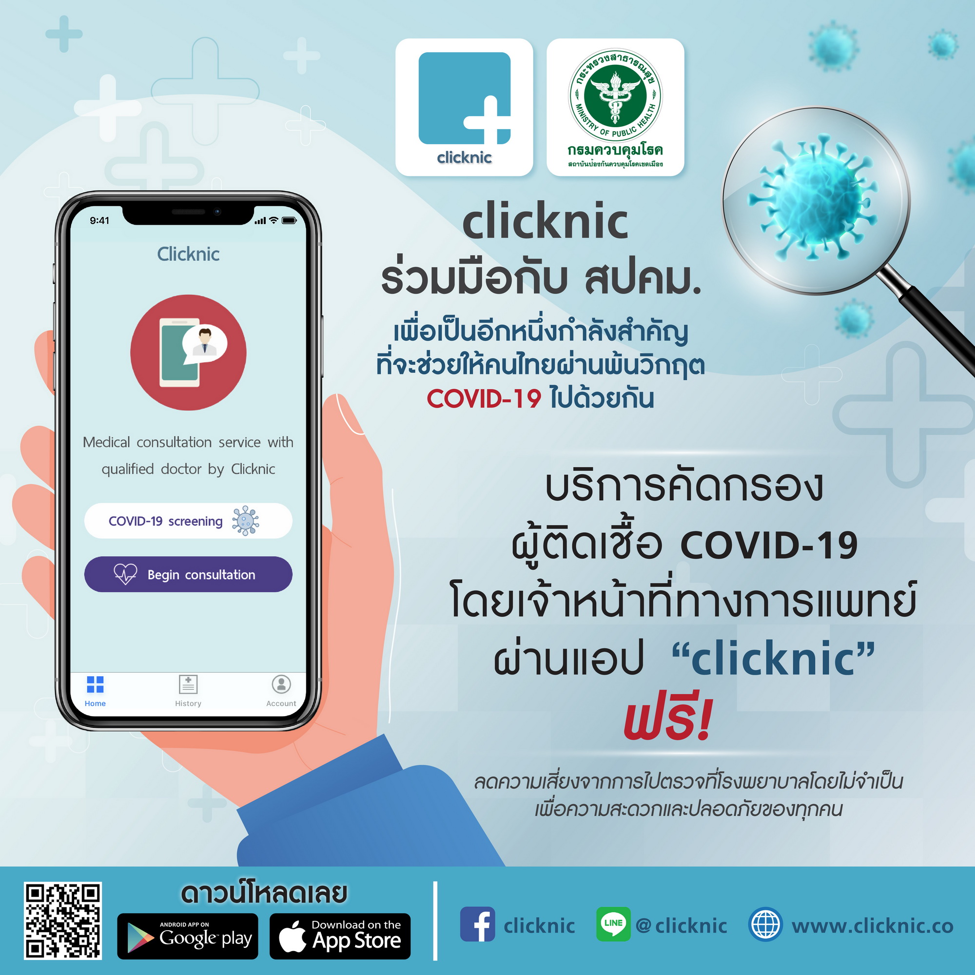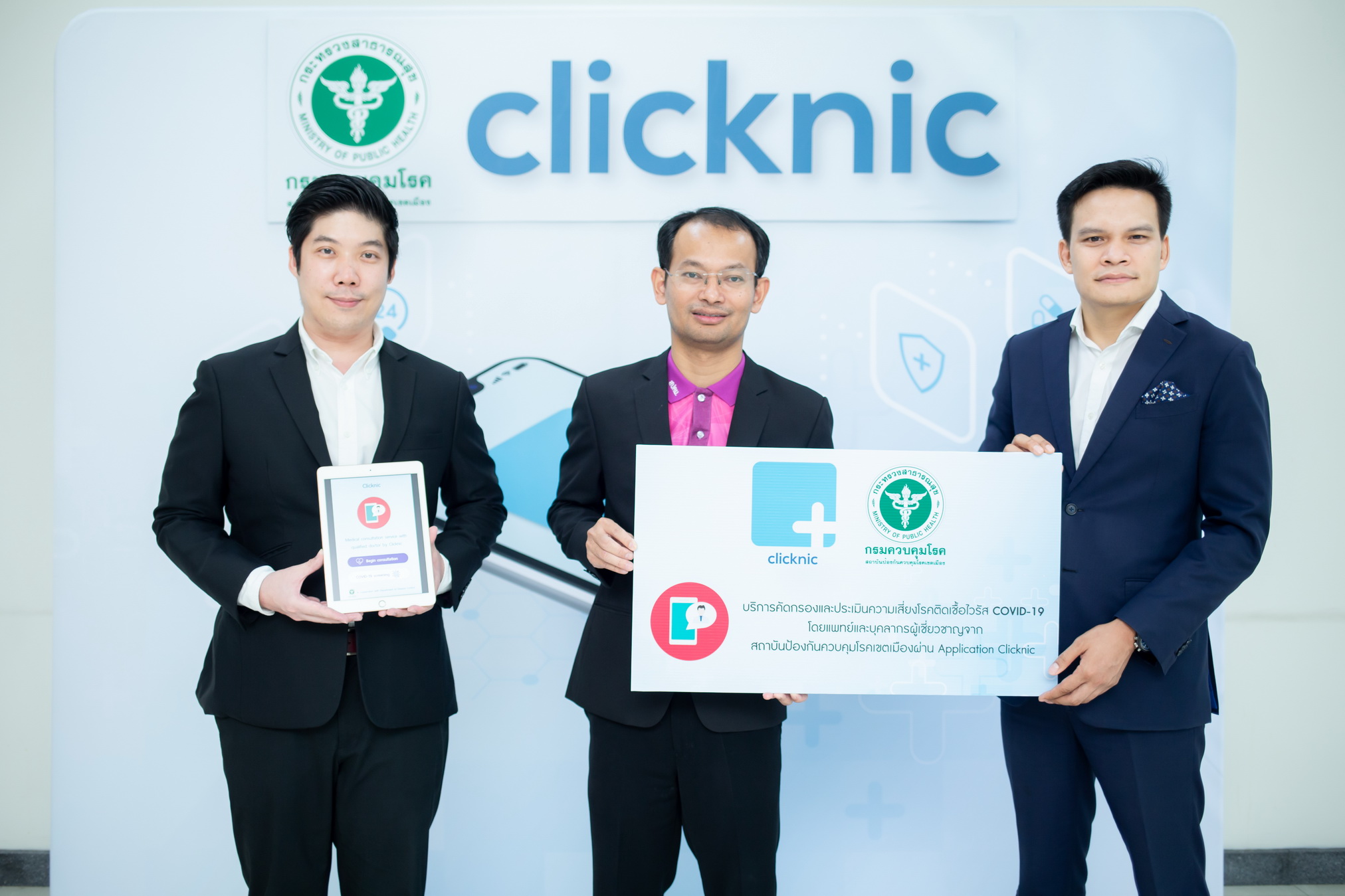จากสถานการณ์การระบาดของไวรัสโควิด-19 คลิกนิก เทเลเมดิซีน ได้ทำการพัฒนาเครื่องมือสำหรับ คัดกรองเบื้องต้นผ่านแอปพลิเคชัน “คลิกนิก” ซึ่งผู้ใช้บริการสามารถเข้าไปกรอกข้อมูลสุขภาพเบื้องต้น เพื่อประเมินความเสี่ยงของตนเอง รวมทั้งสามารถขอรับคำปรึกษาในรูปแบบ วิดีโอคอล (VDO Call) กับเจ้าหน้าที่ทางการแพทย์ได้ โดยบริการดังกล่าวนี้ ได้เริ่มทดลองเปิดใช้บริการมาตั้งแต่วันที่ 19 มีนาคม 2563 ที่ผ่านมาในเขตจังหวัดสมุทรปราการ