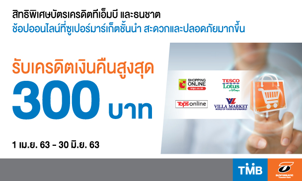 13 เมษายน 2563 : บัตรเครดิตทีเอ็มบี และบัตรเครดิตธนชาต มอบสิทธิพิเศษให้ลูกค้าช้อปออนไลน์ที่ซูเปอร์มาร์เก็ตชั้นนำที่ร่วมรายการ ได้แก่ Big C , Tesco Lotus , TOPS, Villa Market สะดวกและปลอดภัยมากขึ้น พร้อมรับเครดิตเงินคืนสูงสุด 300 บาท/ บัญชีบัตรหลัก / ธนาคาร ตลอดรายการ (รวมทุกเว็บไซต์ที่ร่วมรายการ) เมื่อมียอดใช้จ่ายที่เว็บไซต์ และ แอปพลิเคชันออนไลน์ ที่ร่วมรายการ ตามเงื่อนไขที่กำหนด ได้แก่ ยอดใช้จ่าย 1,500 – 2,499 บาท/เซลล์สลิป รับเครดิตเงินคืน 55 บาท และยอดใช้จ่ายตั้งแต่ 2,500 บาทขึ้นไป/ เซลล์สลิป รับเครดิตเงินคืน 100 บาท