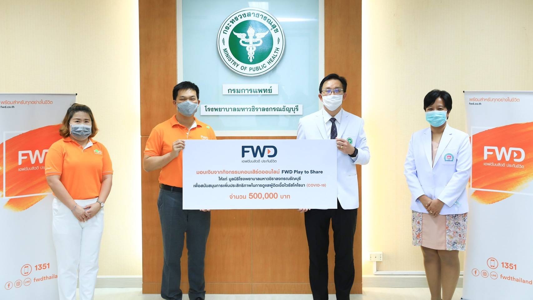 14 เมษายน 2563 : ปรีชา รุธิรพงษ์ (ที่ 2 จากซ้าย) ประธานเจ้าหน้าที่สายงานการตลาด บริษัท เอฟดับบลิวดี ประกันชีวิต จำกัด (มหาชน) มอบเงินบริจาค 500,000 บาท ให้กับโรงพยาบาลมหาวชิราลงกรณธัญบุรี โดยมี นายแพทย์อาคม ชัยวีระวัฒนะ (ที่ 2 จากขวา) ผู้อำนวยการโรงพยาบาล เป็นผู้รับมอบ โดยเป็นเงินจากการจัดกิจกรรมคอนเสิร์ตออนไลน์ “FWD Play to Share” ของ ที วง Jetset’er และ เป๊ก วง Zeal บนเฟสบุ๊ค FWD Thailand ซี่งได้รับความนิยมเป็นอย่างมาก โดยมีผู้เข้าชมมากกว่า 1 ล้านวิว และเพิ่มขึ้นอย่างต่อเนื่อง
