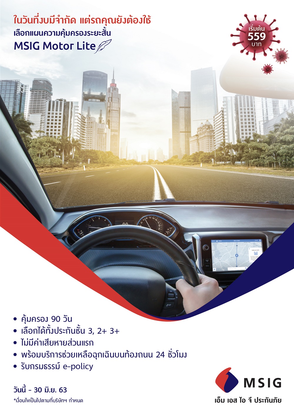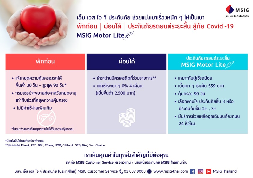 นายรัฐพล กล่าวเพิ่มเติมว่า นอกจาก 2 มาตรการข้างต้น บริษัทฯ ยังได้ออกแผนประกันภัยรถยนต์ MSIG Motor Lite ที่ให้ความคุ้มครองระยะสั้น 90 วัน เบี้ยประกันภัยเริ่มต้นที่ 559 บาท เหมาะสำหรับผู้มีงบจำกัด หรือใช้รถน้อย โดยลูกค้าสามารถเลือกได้ทั้งประกันภัยรถยนต์ชั้น 3, ประกัน 2+ และประกัน 3+ ไม่ต้องจ่ายค่าเสียหายส่วนแรก พร้อมรับบริการช่วยเหลือฉุกเฉินบนท้องถนนตลอด 24 ชั่วโมง